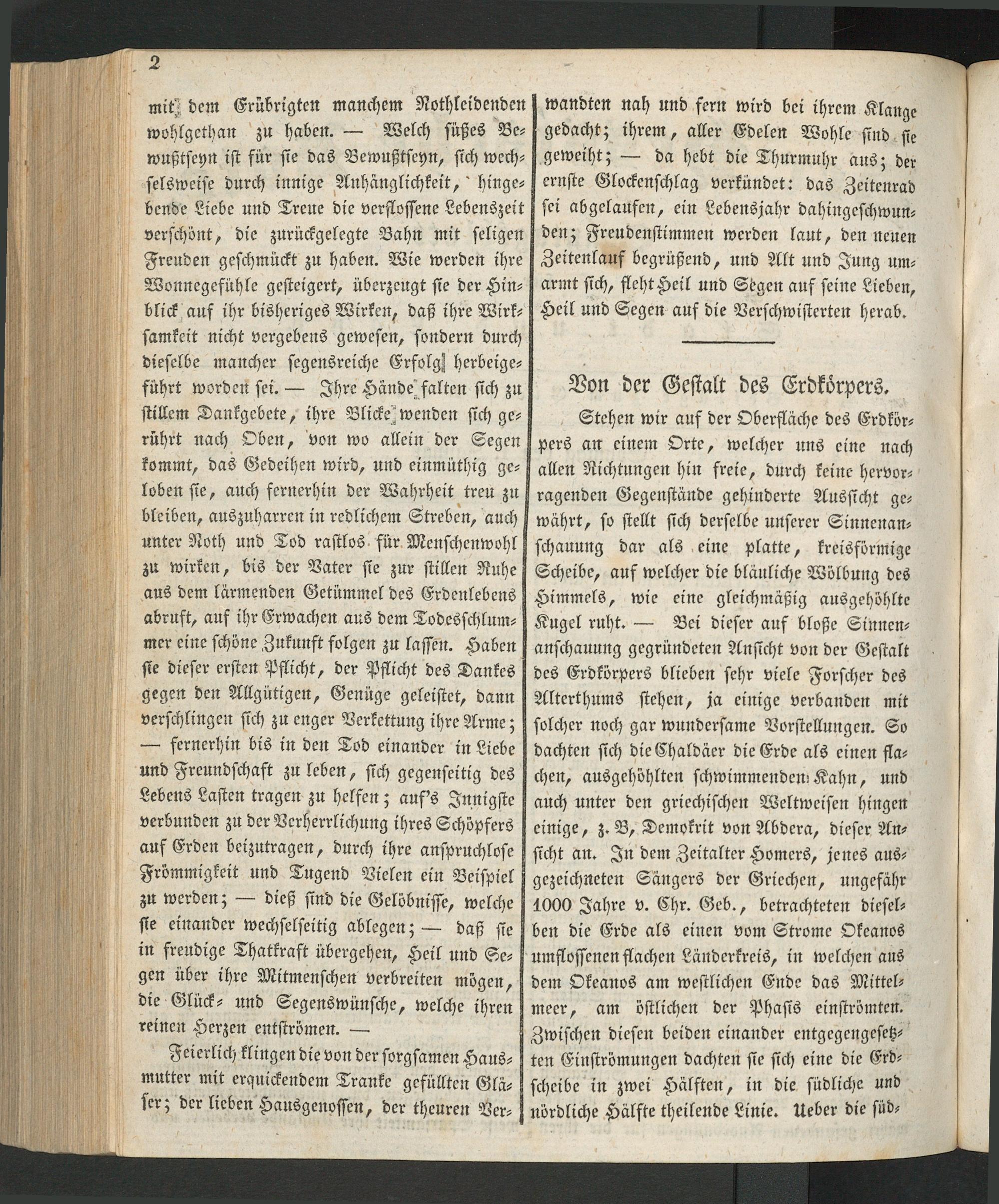 Stehen wir auf der Oberfläche des Erdkör⸗ pers an einem Orte, welcher uns eine nach allen Richtungen hin freie, durch keine hervor— ragenden Gegenstände gehinderte Aussicht ge— währt, so stellt sich derselbe unserer Sinnenan⸗ schauung dar als eine platte, kreisförmige Scheibe, auf welcher die bläuliche Wölbung des Himmels, wie eine gleichmäßig ausgehöhlte Kugel ruht.— Bei dieser auf bloße Sinnen⸗ anschauung gegründeten Ansicht von der Gestalt des Erdkörpers blieben sehr viele Forscher des Alterthums stehen, ja einige verbanden mit solcher noch gar wundersame Vorstellungen. So dachten sich die Chaldäer die Erde als einen fla— chen, ausgehöhlten schwimmenden Kahn, und auch unter den griechischen Weltweisen hingen einige, z. B, Demokrit von Abdera, dieser An— sicht an. In dem Zeitalter Homers, jenes aus⸗ gezeichneten Sängers der Griechen, ungefähr 1000 Jahre v. Chr. Geb., betrachteten diesel—⸗ ben die Erde als einen vom Strome Okeanos umflossenen flachen Länderkreis, in welchen aus dem Okeanos am westlichen Ende das Mittel—⸗ meer, am östlichen der Phasis einströmten. Zwischen diesen beiden einander entgegengesetz ten Einströmungen dachten sie sich eine die Erd⸗ scheibe in zwei Hälften, in die südliche und