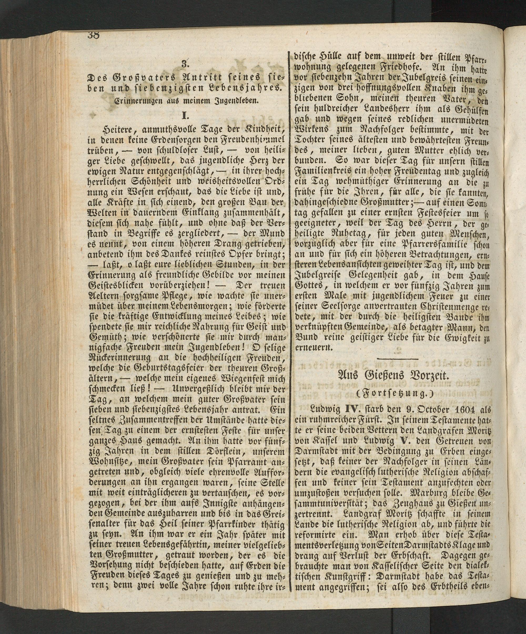 Heitere, anmuthsvolle Tage der Kindheit, in denen keine Erdensorgen den Freudenhimmel trüben,— von schuldloser Lust,— von heili⸗ ger Liebe geschwellt, das jugendliche Herz der ewigen Natur entgegenschlägt,— in ihrer hoch⸗ herrlichen Schönheit und weisheitsvollen Ord— nung ein Wesen erschaut, das die Liebe ist und, alle Kräfte in sich einend, den großen Bau der, Welten in dauerndem Einklang zusammenhält, diesem sich nahe fühlt, und ohne daß der Ver⸗ stand in Begriffe es zergliedert,— der Mund es nennt, von einem höheren Drang getrieben, anbetend ihm des Dankes reinstes Opfer bringt; — laßt, o laßt eure lieblichen Stunden, in der Erinnerung als freundliche Gebilde vor meinen Geistesblicken vorüberziehen!— Der treuen Aeltern sorgsame Pflege, wie wachte sie uner⸗ müdet über meinem Lebensmorgen; wie förderte sie die kräftige Entwicklung meines Leibes; wie spendete sie mir reichliche Nahrung für Geist und Gemüth; wie verschönerte sie mir durch man⸗ nigfache Freuden mein Jugendleben! O selige Ruͤckerinnerung an die hochheiligen Freuden, welche die Geburtstagsfeier der theuren Groß ältern,— welche mein eigenes Wiegenfest mich schmecken ließ!— Unvergeßlich bleibt mir der Tag, an welchem mein guter Großvater sein sieben und siebenzigstes Lebensjahr antrat. Ein seltnes Zusammentreffen der Umstände hatte die— sen Tag zu einem der ernstesten Feste für unser ganzes Haus gemacht. An ihm hatte vor fünf⸗ zig Jahren in dem stillen Dörflein, unserem Wohnsitze, mein Großvater sein Pfarramt an⸗ getreten und, obgleich viele ehrenvolle Auffor⸗ derungen an ihn ergangen waren, seine Stelle mit weit einträglicheren zu vertauschen, es vor⸗ gezogen, bei der ihm aufs Innigste anhängen⸗ den Gemeinde auszuharren und bis in das Grei⸗ senalter für das Heil seiner Pfarrkinder thätig zu seyn. An ihm war er ein Jahr später mit seiner treuen Lebensgefährtin, meiner vielgelieb⸗ ten Großmutter, getraut worden, der es die Vorsehung nicht beschieden hatte, auf Erden die Freuden dieses Tages zu genießen und zu meh⸗ ren; denn zwei volle Jahre schon ruhte ihre ir⸗