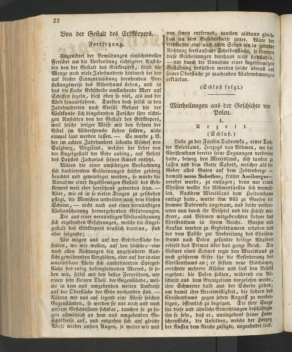 Ungeachtet der Bemühungen einsichtsvoller Forscher um die Verbreitung richtigerer Ansich⸗ ten von der Gestalt des Erdkörpers, blieb die Menge noch viele Jahrhunderte hindurch bei der auf bloßer Sinnentäuschung beruhenden Vor— stellungsweise des Alterthums stehen, und in das die flache Erdscheibe umfluthende Meer auf Schiffen segeln, hieß eben so viel, als aus der Welt hinausfahren. Durften doch selbst in den Jahrhunderten nach Christi Geburt die der Weltkunde sich hingebenden Forscher ihre richti⸗ gen Ansichten von der Gestalt des Erdkörpers, weil solche irriger Weise mit den Lehren der Bibel im Widerspruche stehen sollten, nicht einmal laut werden lassen.— So wurde z. B. der im achten Jahrhundert lebende Bischof von Salzburg, Virgilius, welcher der Lehre von der Kugelgestalt der Erde anhing, auf Befehl des Papstes Zacharias seines Amtes entsetzt.