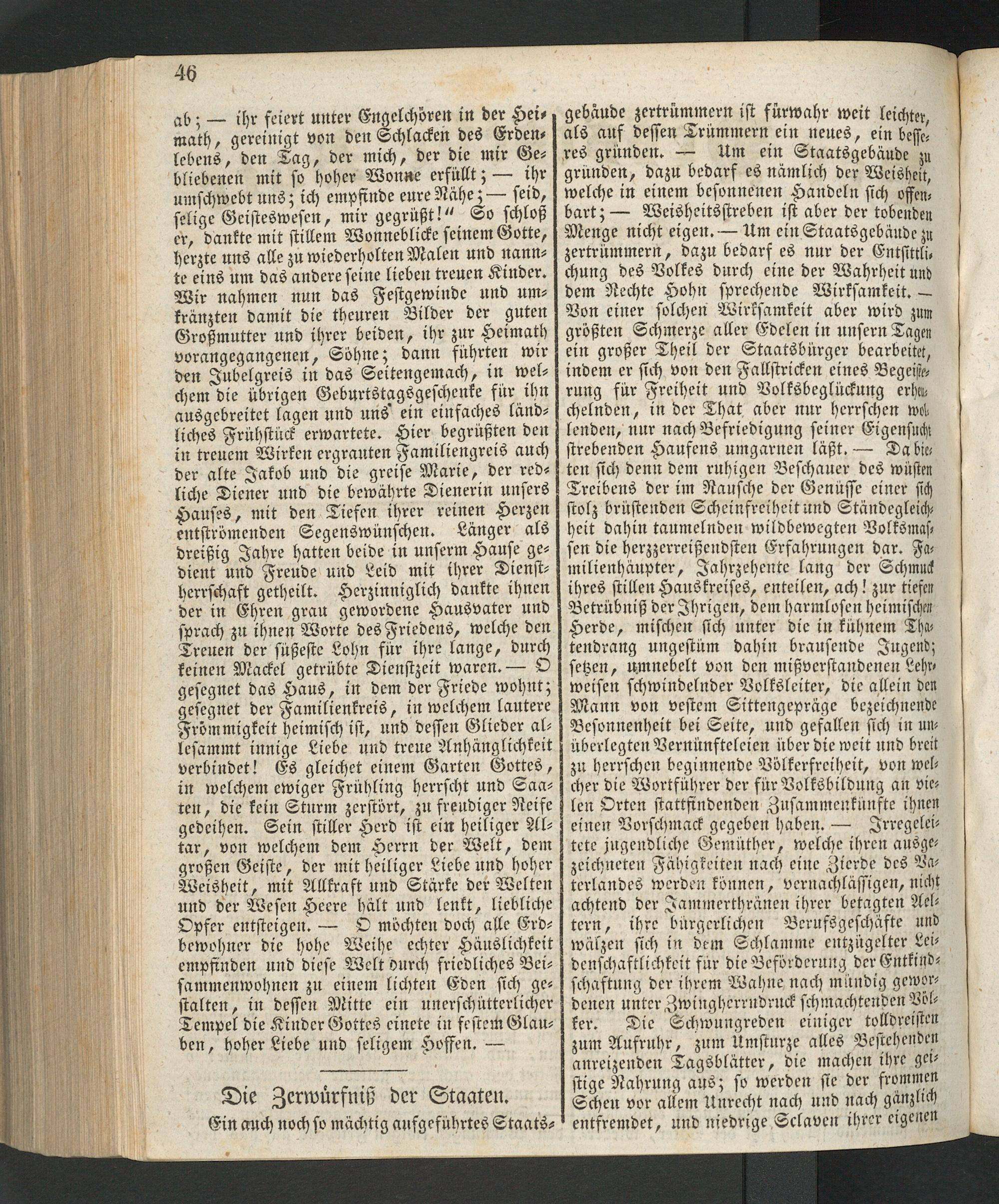 gebäude zertrümmern ist furwahr weit leichter als auf dessen Trümmern ein neues, ein besse res gründen.— Um ein Staatsgebäude zu gründen, dazu bedarf es nämlich der Weisheit welche in einem besonnenen Handeln sich offen, bart;— Weisheitsstreben ist aber der tobenden Menge nicht eigen.— Um ein Staatsgebäude zu zertrümmern, dazu bedarf es nur der Entsittli⸗ chung des Volkes durch eine der Wahrheit und dem Nechte Hohn sprechende Wirksamkeit.— Von einer solchen Wirksamkeit aber wird zun größten Schmerze aller Edelen in unsern Tagen ein großer Theil der Staatsbürger bearbeitet, indem er sich von den Fallstricken eines Begeist⸗ rung für Freiheit und Volksbeglückung erhu⸗ chelnden, in der That aber nur herrschen wol lenden, nur nach Befriedigung seiner Eigensucht strebenden Haufens umgarnen läßt.— Da bie ten sich denn dem ruhigen Beschauer des wüsten Treibens der im Rausche der Genüsse einer sich stolz brüstenden Scheinfreiheit und Ständegleich⸗ heit dahin taumelnden wildbewegten Volksmas— sen die herzzerreißendsten Erfahrungen dar. Fa— milienhäupter, Jahrzehente lang der Schmut ihres stillen Hauskreises, enteilen, ach! zur tiefen Betrübniß der Ihrigen, dem harmlosen heimischen Herde, mischen sich unter die in kuͤhnem Tha⸗ tendrang ungestüm dahin brausende Jugend; setzen, umnebelt von den mißverstandenen Lehr weisen schwindelnder Volksleiter, die allein den Mann von vestem Sittengepräge bezeichnende Besonnenheit bei Seite, und gefallen sich in un— überlegten Vernünfteleien über die weit und breit zu herrschen beginnende Völkerfreiheit, von wel— cher die Wortführer der für Volksbildung an vie⸗ len Orten stattfindenden Zusammenkuünfte ihnen einen Vorschmack gegeben haben.— Irregelei— tete jugendliche Gemüther, welche ihren ausge— zeichneten Fähigkeiten nach eine Zierde des Va⸗ terlandes werden können, vernachlässigen, nicht achtend der Jammerthränen ihrer betagten Ael— tern, ihre bürgerlichen Berufsgeschäfte und wälzen sich in dem Schlamme entzügelter Lei— denschaftlichkeit fur die Beförderung der Entkind⸗ schaftung der ihrem Wahne nach mündig gewor⸗ denen unter Zwingherrndruck schmachtenden Völ— ker. Die Schwungreden einiger tolldreisten zum Aufruhr, zum Umsturze alles Bestehenden anreizenden Tagsblätter, die machen ihre gei⸗ stige Nahrung aus; so werden sie der frommen