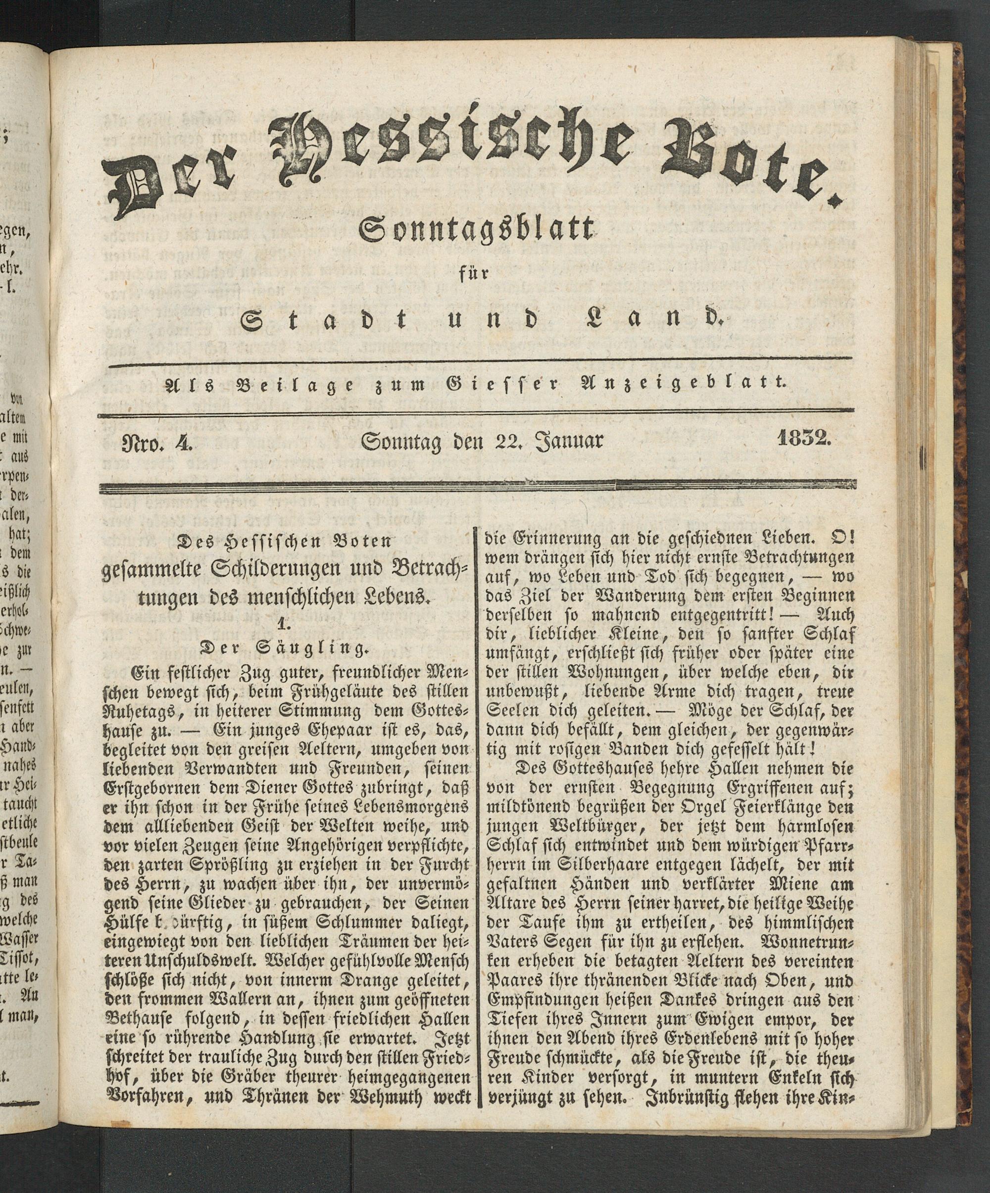 Ein festlicher Zug guter, freundlicher Men⸗ schen bewegt sich, beim Frühgeläute des stillen Nuhetags, in heiterer Stimmung dem Gottes⸗ hause zu.— Ein junges Ehepaar ist es, das, begleitet von den greisen Aeltern, umgeben von liebenden Verwandten und Freunden, seinen Erstgebornen dem Diener Gottes zubringt, daß er ihn schon in der Frühe seines Lebensmorgens dem allliebenden Geist der Welten weihe, und vor vielen Zeugen seine Angehörigen verpflichte, den zarten Sprößling zu erziehen in der Furcht des Herrn, zu wachen über ihn, der unvermö⸗ gend seine Glieder zu gebrauchen, der Seinen Hülfe b. ürftig, in sußem Schlummer daliegt, eingewiegt von den lieblichen Träumen der hei⸗ teren Unschuldswelt. Welcher gefühlvolle Mensch schlöße sich nicht, von innerm Drange geleitet, den frommen Wallern an, ihnen zum geöffneten Bethause folgend, in dessen friedlichen Hallen eine so rührende Handlung sie erwartet. Jetzt schreitet der trauliche Zug durch den stillen Fried⸗