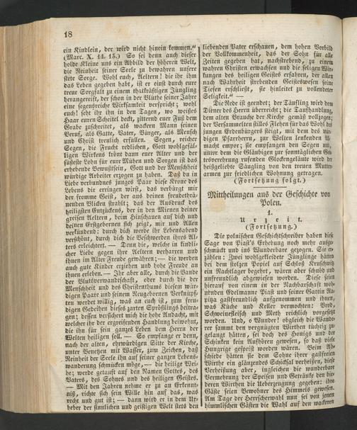 Die polnischen Geschichtschreiber haben diese Sage von Piast's Erhebung noch mehr ausge⸗ schmückt und ins Wunderbare gezogen. Sie er— zählen: Zwei wohlgekleidete Jünglinge hätten bei dem stolzen Popiel auf Schloß Kruschwitz ein Nachtlager begehrt, wären aber schnöd und unfreundlich abgewiesen worden. Diese seien hierauf von einem in der Nachbarschaft woh⸗ nenden Edelmanne Piast und seiner Gattin Na⸗ pitza gastfreundlich aufgenommen und ihnen, was Küche und Keller vermochten: Brod, Schweinefleisch und Meth reichlich vorgesetzt worden. Und, o Wunder! obgleich die Wande⸗ rer sammt den vergnügten Wirthen tüchtig zu⸗ gelangt hätten, sei doch des Honigs und der Schinken kein Aufhören gewesen, so daß viele Hungrige gespeist worden wären. Beim Ab⸗ schiede hätten sie dem Sohne ihrer gastfreien Wirthe ein glänzendes Schicksal verheißen, diese Verheißung aber, ingleichen die wunderbare Vermehrung der Speisen und Getränke den bie⸗ deren Wirthen die Ueberzeugung gegeben: ihre Gäste seien Bewohner des Himmels gewesen. Am Tage der Herrscherwahl nun sei von jenen himmlischen Gaͤsten die Wahl auf den wackeren