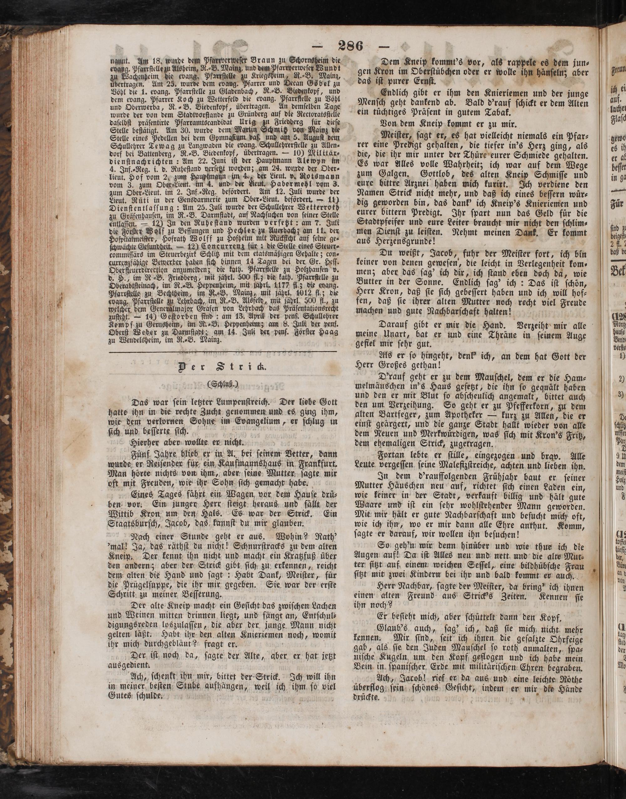 D'rauf geht er zu dem Mauſchel, dem er die Ham⸗ melmäuschen in's Haus geſetzt, die ihn ſo gequält haben und den er mit Blut ſo abſcheulich angemalt, bittet auch den um Verzeihung. So geht er zu Pfefferkorn, zu dem alten Bartfeger, zum Apotheker— kurz zu Allen, die er einſt geärgert, und die ganze Stadt hallt wieder von alle dem Neuen und Merkwürdigen, was ſich mit Kron's Fritz, dem ehemaligen Strick, zugetragen. a