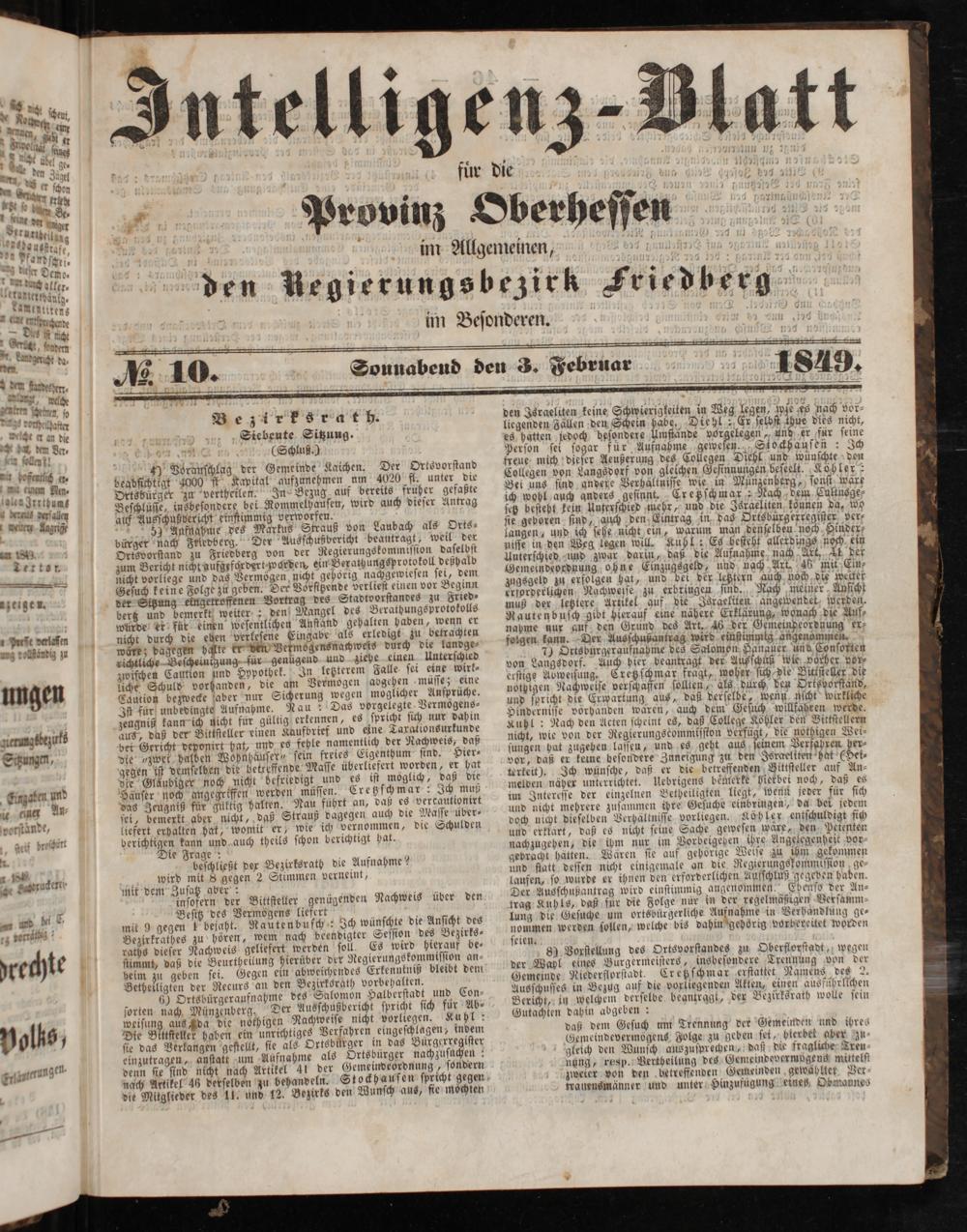 8) Vorſtellung des Ortsvorſtandes zu Oberflorſtadt, wegen der Wahl eines Burgermeiſters, insbeſondere Trennung von der Gemeinde Niederflorſtadt. Cretzſchmar erſtattet Namens des 2. Ausſchuſſes in Bezug auf die vorliegenden Akten, einen ausführlichen Bericht, in welchem derſelbe beantragt, der Bezirksrath wolle ſein Gutachten dahin abgeben: