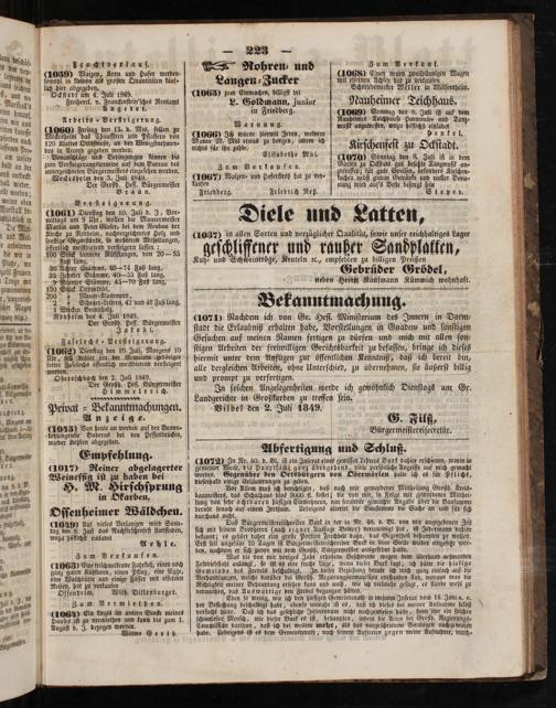 Faſelochs⸗Verſteigerung. (1062) Dienſtag den 10. Juli, Morgens 10 Ubr, ſoll vabier ein der Gemeinde gehöriger fetter Faſelochs öffentlich meiſtbietend verſteigert werden. Obereſchbach den 2. Juli 1849. i Der Großh. Heſſ. Bürgermeiſter immelreich. 1