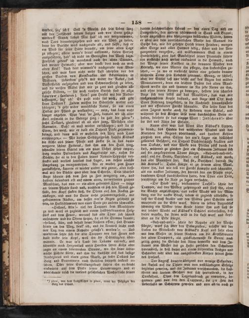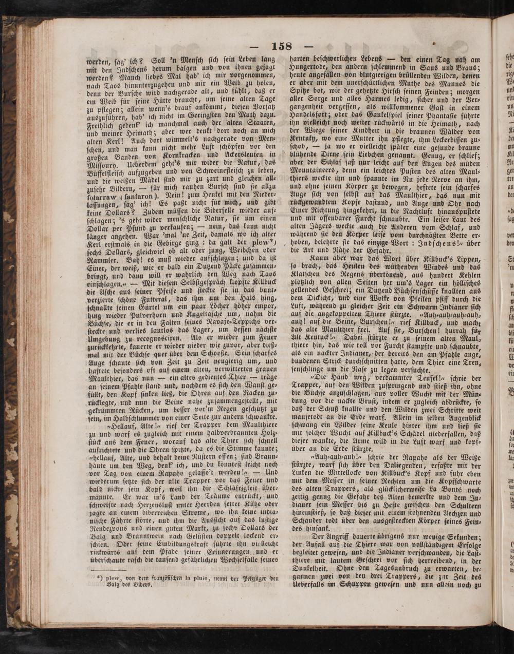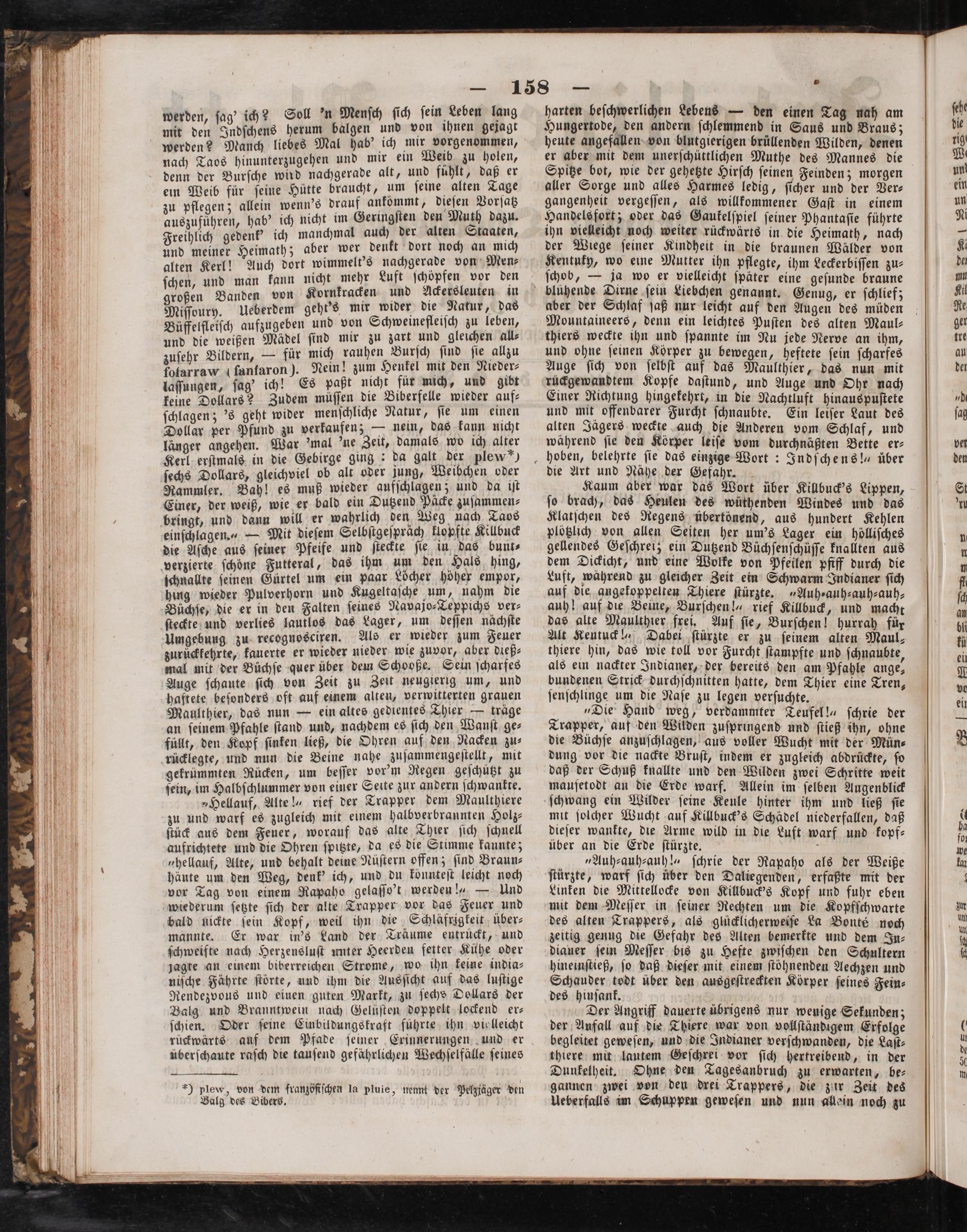 zu und warf es zugleich mit einem halbverbrannten Holz- ſtück aus dem Feuer, worauf das alte Thier ſich ſchnell aufrichtete und die Ohren ſpitzte, da es die Stimme kannte; „hellauf, Alte, und behalt deine Nüſtern offen; ſind Braun⸗ häute um den Weg, denk' ich, und du könnteſt leicht noch vor Tag von einem Rapaho gelaſſo't werden!“— Und wiederum ſetzte ſich der alte Trapper vor das Feuer und bald nickte ſein Kopf, weil ihn die Schläfrigkeit über⸗ mannte. Er war in's Land der Träume entrückt, und ſchweifte nach Herzensluſt unter Heerden fetter Kühe oder jagte an einem biberreichen Strome, wo ihn keine india⸗ niſche Fährte ſtörte, und ihm die Ausſicht auf das luſtige Rendezvous und einen guten Markt, zu ſechs Dollars der Balg und Branntwein nach Gelüſten doppelt lockend er⸗ ſchien. Oder ſeine Einbildungskraft führte ihn vielleicht