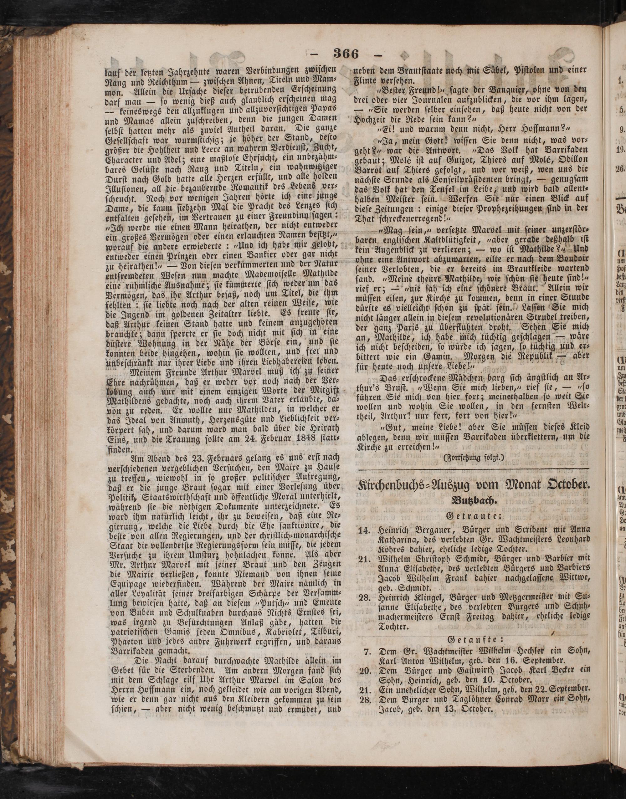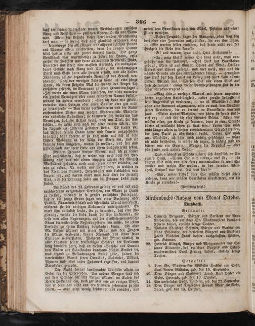 —„Sie werden ſelber einſehen, daß heute nicht von der Hochzeit die Rede ſein kann?“ „Ei! und warum denn nicht, Herr Hoffmann?“ „Ja, mein Gott! wiſſen Sie denn nicht, was vor— geht?“ war die Antwort.„Das Volk hat Barrikaden