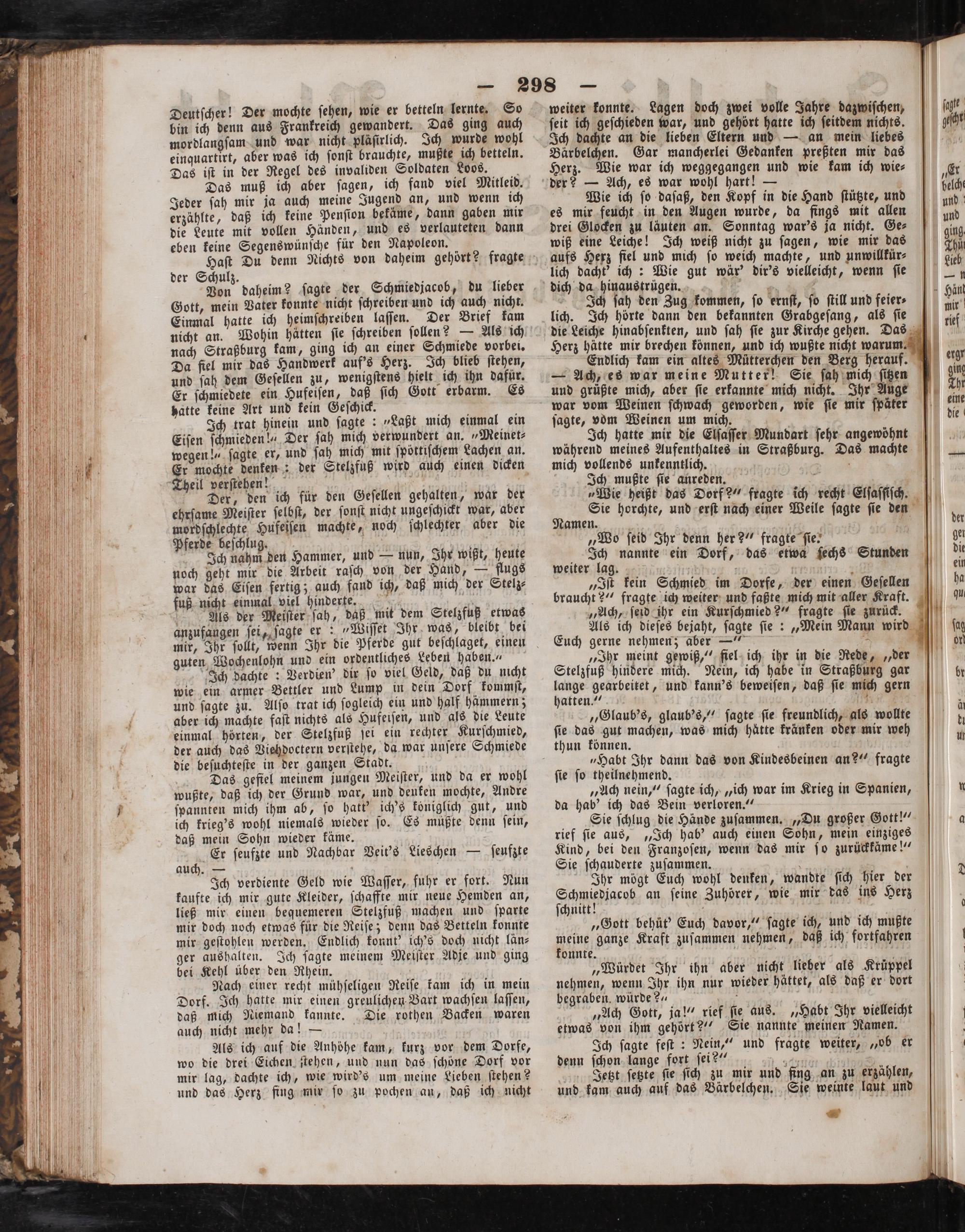 thun können.* „Habt Ihr dann das von Kindesbeinen an?“ fragte ſie ſo theilnehmend. „Ach nein,“ ſagte ich,„ich war im Krieg in Spanien,. da hab' ich das Bein verloren.“ Sie ſchlug die Hände zuſammen.„Du großer Gott!“ a rief ſie aus,„Ich hab' auch einen Sohn, mein einziges Kind, bei den Franzoſen, wenn das mir ſo zurückkäme!“ Sie ſchauderte zuſammen. g f 8 Ihr mögt Euch wohl denken, wandte ſich hier der c an ſeine Zuhörer, wie mir das ins Herz N nitt! N i „Gott behüt' Euch davor,“ ſagte ich, und ich mußte meine ganze Kraft zuſammen nehmen, daß ich fortfahren a