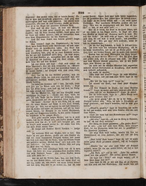 Von daheim? ſagte der Schmiedjacob, du lieber Gott, mein Vater konnte nicht ſchreiben und ich auch nicht. Einmal hatte ich heimſchreiben laſſen. Der Brief kam nicht an. Wohin hätten ſie ſchreiben ſollen?— Als ich nach Straßburg kam, ging ich an einer Schmiede vorbei. Da ſiel mir das Handwerk auf's Herz. Ich blieb ſtehen, und ſah dem Geſellen zu, wenigſtens hielt ich ihn dafür. Er ſchmiedete ein Hufeiſen, daß ſich Gott erbarm. Es hatte keine Art und kein Geſchick.