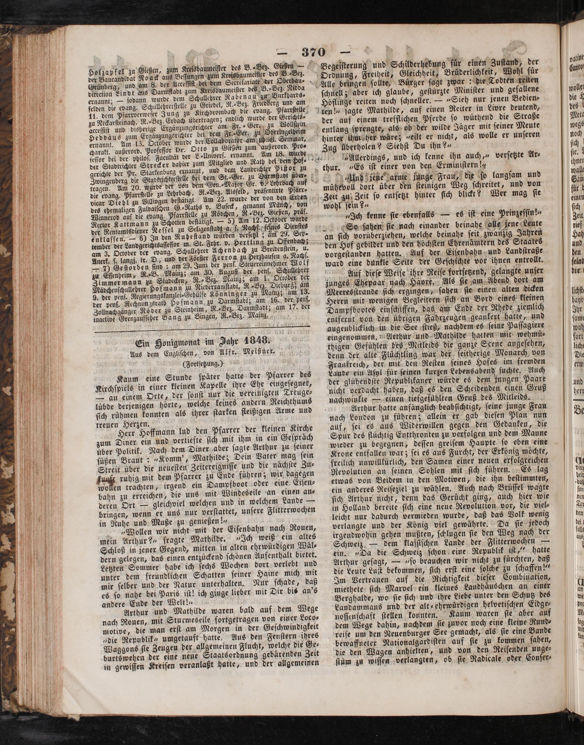 Mädchenſchullehrer Hofmann zu Rirderkamftadt, R. Bez Diabürg 40 junges Ehepaar nach Havre. Als ſie am Abend dort am 8 der 5 ane B an. Sage Fun e der e 7 7 ſich ergingen, ſahen ſie einen alten dicken er penſ. Rechnungsrath Hofmann, 5 dci, ſerrn mit wenigen Begleitern ſich an Bord eines kleinen inheim, R.⸗Bez. Darmſtadt; am 17. der l Pan 14 nee dalle Hranaſher Bang an Ager, N. Bez. Mam Dampfbootes einſchiffen, das am Ende der Rhede ziemlich 925. entfernt von den übrigen Fahrzeugen geankert hatte, und 111 1 augenblicklich in die See ſtieß, nachdem es ſeine Paſſagiere Ein Honigmonat im Jahr 1848. eingenommen. Arthur und Mathilde hatten mit wehmü⸗ Aus dem Engliſchen, von Alfr. Meißner. f thigen Gefühlen des Mitleids die ganze Scene angeſehen, (Fortfehung) f denn der alte Flüchtling war der ſeitherige Monarch von 1 0 Frankreich, der mit den Reſten ſeines Hofes im fremden N Kaum eine Stunde ſpäter hatte der Pfarrer des Lande ein Aſyl für ſeinen kurzen Lebensabend ſuchte. Auch Kirchſpiels in einer kleinen Kapelle ihre Ehe eingeſegnet, der glühendſte Republikaner würde es dem jungen Paare — an einem Orte, der ſonſt, nur die vereinigten Treuge⸗ nicht verdacht haben, daß es den Scheidenden einen Gruß lübde derjenigen hörte, welche keines andern Reichthums nachwinkte— einen tiefgefühlten Gruß des Mitleids. ſich rühmen konnten als ihrer ſtarken fleißigen Arme und Arthur hatte anfänglich beabſichtigt, ſeine junge Frau treuen Herzen. 5 008 a nach London zu führen; allein er gab dieſen Plan nun Herr Hoffmann lud den Pfarrer der kleinen Kirche auf, ſei es aus Widerwillen gegen den Gedanken, die zum Diner ein und vertiefte ſich mit ihm in ein Geſpräch Spur des flüchtig Entthronten zu verfolgen und dem Manne uͤber Politik. Nach dem Diner aber ſagte Arthur zu ſeiner wieder zu begegnen, deſſen greiſem Haupte. ſo eben eine ſüßen Braut:„Komm', Mathilde; Dein Vater mag ſein Krone entfallen war; ſei es aus Furcht, der Exkönig möchte, Streit über die neueſten Zeitereigniſſe und die nächſte Zu- freilich unwillkürlich, den Samen einer neuen erfolgreichen Sue ruhig mit dem Pfarrer zu Ende führen; wir dagegen Revolution an ſeinen Sohlen mit ſich führen. Es lag wollen trachten, irgend ein Dampfboot oder eine Eiſen⸗ Metwas von Beidem in den Motiven, die ihn beſtimmten, bahn zu erreichen, die uns mit Windeseile an einen an⸗ ein anderes Reiſeziel zu wählen. Auch nach Brüſſel wagte deren Ort— gleichviel welchen und in welchem Lande— ſich Arthur nicht, denn das Gerücht ging, auch hier wie bringen, wenn er uns nur verſtattet, unſere Flitterwochen in Holland bereite ſich eine neue Revolution vor, die viel⸗ in Ruhe und Muße zu genießen! 5 leicht nur dadurch vermieden wurde, daß das Volk wenig „Wollen wir nicht mit der Eiſenbahn nach Rouen, verlangte und der Konig viel gewährte. Da ſie jedoch mein Arthur?“ fragte Mathilde.„Ich weiß ein altes irgendwohin gehen mußten, ſchlugen ſie den Weg nach der Schloß in jener Gegend, mitten in alten ehrwürdigen Wäl⸗ Schweiz.— dem klaſſiſchen Lande der Flitterwochen— dern gelegen, das einen entzückend ſchönen Aufenthalt bietet. ein.„Da die Schweiz ſchon eine Republik iſt,“ hatte Letzten Sommer habe ich ſechs Wochen dort verlebt und Arthur geſagt,—„ſo brauchen wir nicht zu fürchten, daß unter dem freundlichen Schatten ſeiner Haine mich mit die Leute Luſt bekommen, ſich erſt eine ſolche zu ſchaffen!“ mir ſelber und der Natur unterhalten. Nur ſchade, daß Im Vertrauen auf die Richtigkeit dieſer Combination, es ſo nahe bei Paris iſt! ich ginge lieber mit Dir bis an's miethete ſich Marvel ein kleines Landhäuschen an einer andere Ende der Welt!“ Berghalde, wo ſie ſich und ihre Liebe unter den Schutz des Arthur und Mathilde waren bald auf dem Wege Landammans und der alt- ehrwürdigen helvetiſchen Eidge⸗ nach Rouen, mit Stucmeseile fortgetragen von, einer Loco- noſſenſchaft ſtellen konnten. Kaum waren ſie aber auf motive, die man erſt am Morgen in der Geſchwindigkeit dem Wege dahin, nachdem ſie zuvor noch eine kleine Rund⸗ „die Republik“ umgetauft hatte. Aus den Fenſtern ihres reiſe um den Neuenburger See gemacht, als ſie eine Bande Waggons ſie Zeugen der allgemeinen Flucht, welche die Ge⸗ bewaffneter Nationalgardiſten auf ſie zu kommen ſahen, burtswehen der eine neue Staatsordnung gebärenden Zeit die den Wagen anhielten, und von den Reiſenden unge⸗ in gewiſſen Kreiſen veranlaßt hatte, und der allgemeinen ſtüm zu wiſſen verlangten, ob ſie Radicale oder Conſer⸗