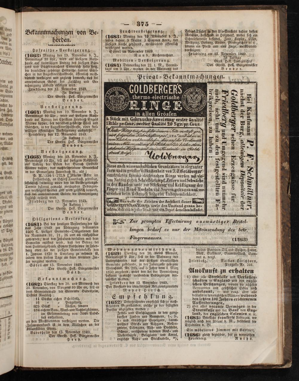 ihres a 5 8 n und Bekanntmachungen von Be⸗ Fruchtverſteigerung⸗ Tobiag Thaler in der Uſa⸗Vorſtadt dahier deſſen W 7 12 J.(1683) Montag den 19. November d. J., Mobilien, beſtehend in Holzwerk, wobei ſich ein *. hoͤrden. ſollen daher 9 Malter 3 Simmer Korn, der. Schreibſecretär befindet, Zinn, Kupfer, Eiſen, den an KAnn hieſigen Kirche gehörend, meiſtbietend öffentlich] Weißzeug, Bettung, Kleivet, Pferdegeſchſer de., en N ö 5 3 b verſteigert werden. f ſodann ein Pferd und eink Ziege, meiſtbietend * Hofraitbe Verſteigerung. Soͤdel im Nobember 1849. verſteigert. 0 8 . leni) 12 5 den 19. Nopember d. J., Ra ab, Kirchenrechner. Friedberg am 19.. 55 1849. ormittags 10 Uhr, wird auf hieſigem Rath⸗ 5988 ö Auftrag ctober. bauſe auf freiwilligen Antrag des hieſigen Bür⸗— e e Groß, Heſſ. Landgerichts gers und Büchſenmachers Emmerich Felix Fritz,(1684) Donnerſtag den 22. l. M., Vormit⸗ Der Großh. Heſſ. Bürgermeiſter die demſelben gehörige Hofraithe ſammt Gärk⸗ tags um 9 Uhr, werden in der Wohnung des Bender. chen in der Auguſtinerſchulſtraße, öffentlich meiſt⸗ 5 7 bietend verſteigert und zugleich bemerkt, daß bei P rivat⸗Bekanntma ch ungen. ö m und annehmbarem Gebot der Zuſchlag und Ge— e Dendel zu nehmigung alsbald erfolgen wird. 7* 5 riedberg den 12. November 1849, 2 54 Ear. Ir 1 9 In Auftrag 2 1140 2 2—— ergeanten Der Großb. Heſſ. Bürgermeiſter 2 55— 2 ochter. Bender. 2 2. ucher da⸗ f a F F.. r Verſtei gerung. 10 S lers Ieh.(1664) Montag den 19. November d. J 8 2. S2 * Vormittags 10 Uhr, wird auf hieſigem Rath⸗ a Stück in allen Gröslen 2— 2 T 2— nd Orts⸗ bauſe auf Antrag der Chriſtian Friedrich Engels ück mit Gebrauchs- Anweisung erster dualité Nattt Wittwe dahier, der derſelben gehörige Stall und 1 Rthlr pr 2 ei ualité 5—— 3 Gärtchen, in der en derne a einer frei⸗* E Cour, zweiter d te 20 Ser Pr. Cour. N 32 i 8— willigen öffentlichen Verſteigerung ausgeſetzt. eee, e,.— 5 8 5 N ö wohnen⸗ Friedberg den 12. November 1849. ere,, e 1171 8 885 5 . 2 215• U 722 g 7 25 3 85 —. Der Greßt. Hef. Bürgermeiſer bee ene, ee, eee ee, 8 u — 8 eee, e e ec, ee, N, kauen, ee, 2 8—* ochter. lee. 5—* Verſteigerung. 5 8 Te 5 Heintich(186) Montag den 19. November d. J., 5 5. S.— — Vormittags 10 Uhr, ſoll auf hieſigem Rathhallſe—0 2 1 ged. den auf Antrag der Erben der Baruch Grödels Diese g 5 N. 2 2 2 2 8 815 Wittwe dahier, das nachbeſchriebene Grundstück duese nach wissenschaftlichen Grundsätzen in eleganter 22 8 1 Orot. in der Gemarkung Fauerbach II., als: Torm und in erösſter Vollkomenkeit von J. CGoldberger ii— 2 Sehn P. N. 354/1272,[AIKlafter Acker im eonstruirten thermb-elertrischen Ringe werden mit w 828.8888 n Son, Holderbuſch, an Schloß Fauerbach, zehntbar, lem Nutzen gegen Sdrefbkrampf. Zi 8 Schugehe 2—— öffentlich freiwillig unter den im Verſteigerungs⸗ in den 114 Sen Ochrebtrampf, ittern und chvãche= 28— Termin bekannt gemacht werdenden Bedingun⸗ nden Hängen Senie zur Stärkung und Kräftigung ler FFF d gen verfteigert werden und wir zugleich bemerkt, Einser und Hand-Muskeln und Nerven getragen und vor F 2 S2. Nen dt Taler cel wird Gebote die Genehmigung 5 Gebrauch keinerlei Unbefuemlichkeit. 8 2 2 J. Okoder Friedberg den 12, November 1849. un ene die Zeichen der Aechthert dieser E 2 2 5 8 16 Uke 56 Heft. Bit 1 ereers ed We sowie den Umstand genau be- 2 4 I 0 Ben de 1.8 2 achten fals sich in jeder Stadt r& Depot derselben befindet. 1** 1 Obligations ⸗Verlooſung. 20 5 1 E f Bürger 7 7 5 3 „ cheliches(16810 Bei der heutigen Verlooſung der für r Zur prompten Eſfectuirung auswärtiger Hestel- 5 das Jahr 1849 zur Abtragung beſtimmten U 13* 17 Tag, 1500 fl. hieſiger Gemeinde ⸗ Obligationen ſind ungen bedarf es nur dler Milein sendun9 des betr. die Nummern 10, 21, 26 und 46 rückzahlbar 5 N 1 Bürgers geworden; was den Inhabern derſelben mit dem Fingermaasses. 116 8 lein Bemerken eröffnet wird, daß der Betrag bei 4463) Seht Ot. dem Handlungshauſe Heeſeen Lindheimer af Fried- 95 nee 7 S f 1 20. Okl. berg oder bei der hieſigen Gemeindekaſſe den o hin un ges ver miethung. breiten Garniren⸗Till und Spi 70 tsbürgets 1. Januar 1850 in Empfang zu nehmen iſt,(1669) Dienſtag den 20. dieſes Monats, Moll, Söſetete, Bann c D lier Nu⸗ 9 von dieſem Tage an keine weiteren Zin⸗] Vormittags 9 Uhr, ſoll in der Wohnung des met u. dergl.. . ſen vergütet werden. Unterzeichneten das der hieſigen israelitiſchen riedberg. ˖ i koth Södel am 13. November 1849. Gemeinde zuſtehende, in der Judengaſſe gelegene 8 55 Nee f Der Großh. Heſſ. Bürgermeiſter] Wohnhaus, Nr. 215, auf 3 Jahre vom 1. März 8 ö 1 it, Vä tt h. 1850 angehend, unter den bei der Vermiethung Auskunft zn erhalten zee /// (1682) Dienſtag den 20. und Mittwoch den Friedberg den 12. November 1849. ten ene n, 21. 9 8 1 10 Uhr an, ſell in][ Der Vorſtand der israelttiſchen Religionsgemeinde eee leben 16 nächſten dem Gemeindewald der Gemeinde Büdesheim, Mayer Hier ſſch. uſibekaunt! e 1255 15655 8 — 1* Scheitholz, E m p f e U u n g. 1 den eugliſchen Blättern während ottiſt 16„„ Prügelholz,(1652) Unterzeichneter empfiehlt ſich zu nach⸗ Auſerder nag gabren erſchtenenen tel! 825 Stück„ Wellen, ſodann ſtehenden Gegenſtänden, welche zu den billigſten 2) über alles Pascher Vermögen in d 4 184 eichene Bau⸗„Werk⸗ und Nutzholzſtämme,“ Preiſen abgegeben werden: Staatskaſſe und der Bank bon E 2 3 im Geſammtbetrag von 7046 Cubik⸗ Zettel⸗ und Einſchlaggarn in den gang⸗ land, den engliſchen Colonien 1 4. — fuß enthaltend, barſten Farben und Nummern, 1⸗, 3⸗,(1686) Briefliche frankirte Anfra 54 8 56 an den Meiſtbietenden verſteigert werden. Die 4, und Edrätbiges Sapetgarn, baum⸗ moglich noch vor Ablauf d. M befördert de 1417 Zuſammenkunft iſt in dem Wäldchen an der wollnes Strick und Nähgarn, Rollen⸗ Exped