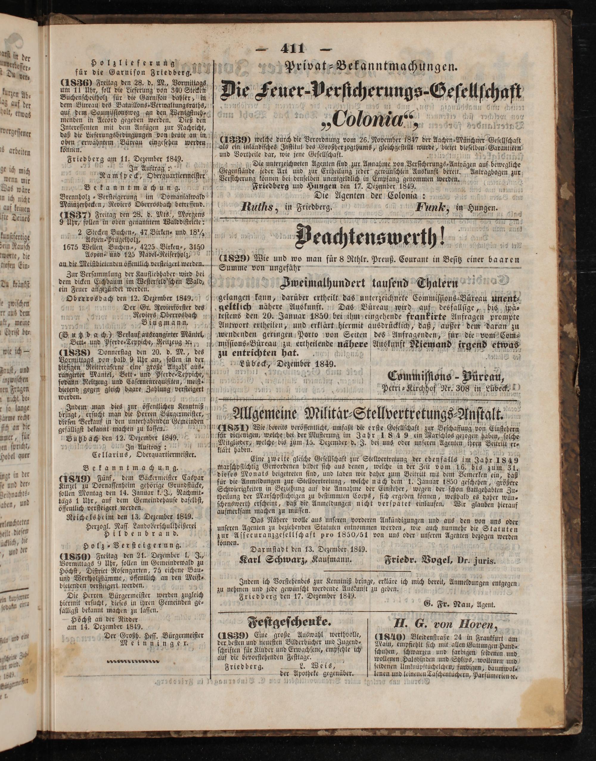 Friedberg und Hungen den 17. Dezember 1849. Die Agenten der Colonia:
