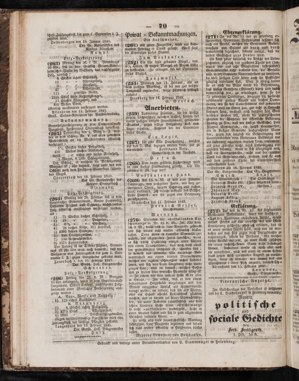 8 Hurt klärung. (271) In der Nr. 13 des zu Friedberg er⸗ ſcheinenden Wetterauer Volksblattes befindet ſich Niever⸗ moxſtadt und Selters als durch und durch democratiſch bezeichnet, ſsban ag daß die beiden Geiſtlichen arge Heuler ſeien.