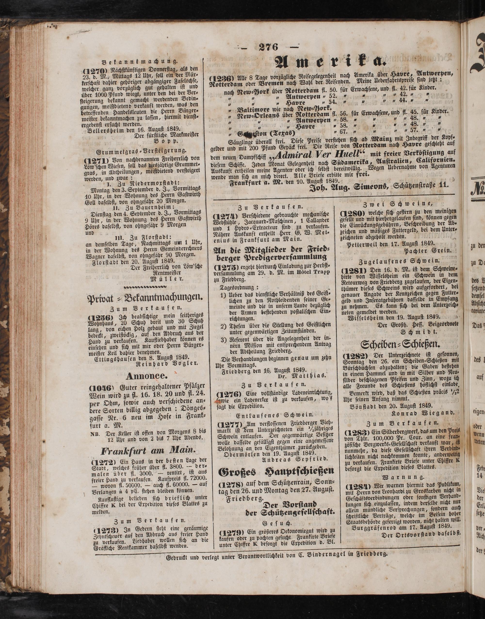 1 ö 7 1 2 5 5 Amerika. (12360) Ale 8 Tage vorzügliche Reiſegelegeneit nach Rotterdam oder Bremen nach Wahl der Reiſenden. nach New⸗Vork über Rotterdam fl. 50. für Erwachsene, und fl. 42. für Kinder.