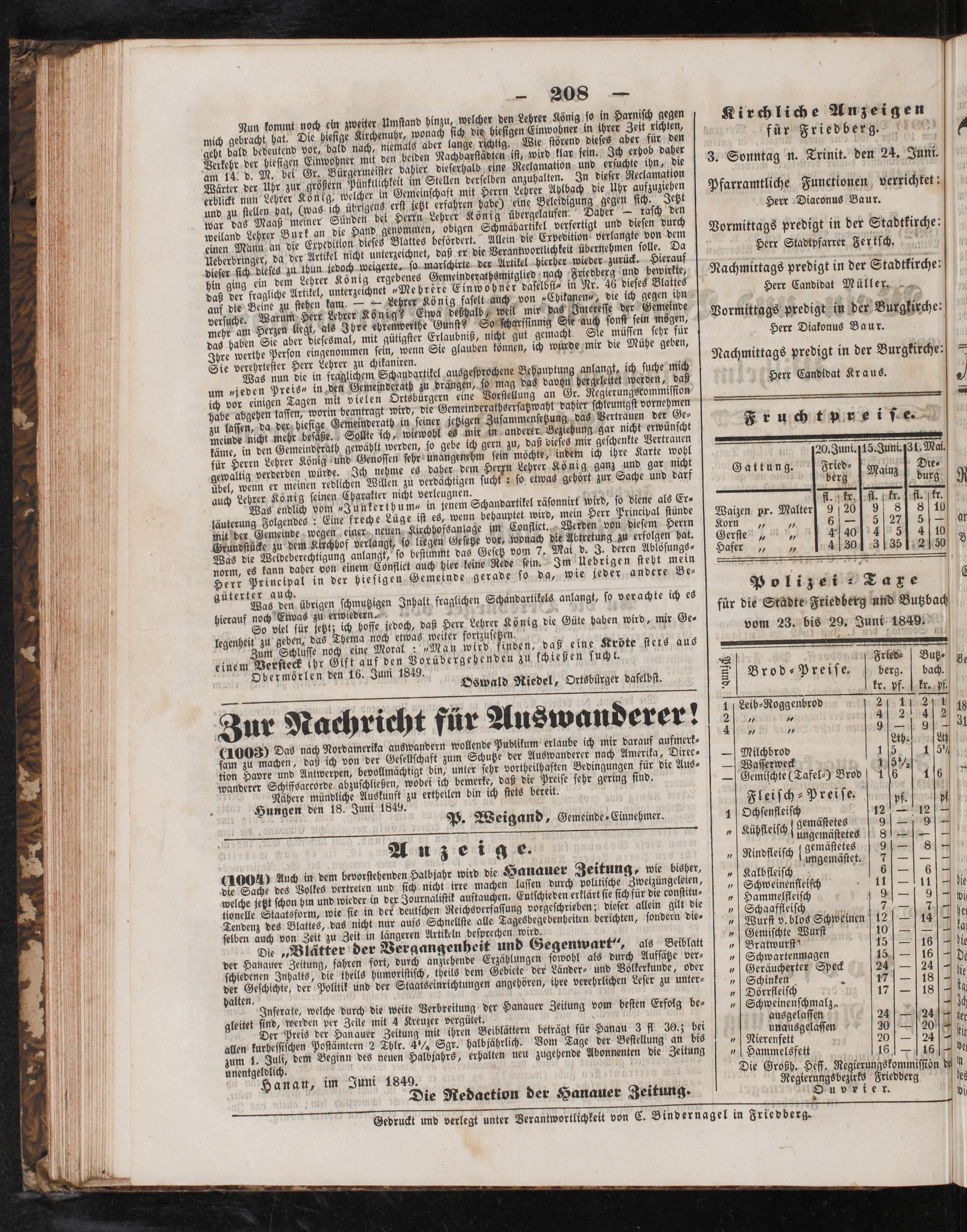 einem Verſteck ihr Gift auf den Vorübergehenden zu ſchießen ſucht. i Sbermoͤrlen den 16. Juni 1849. 5 5 No Friev⸗ Butz g Oswald Riedel, Ortsbürger daſelbſt. 8 rod ⸗ eiſe. berg. bach. . 8 kr. pf. kr. pf. 2 2 11 Leib⸗Roggenbrod 21510 2 6 4 Zur Nachricht für Auswanderer! 2 304 (1003) Das nach Nordamerika auswandern wollende Publikum erlaube ich mir darauf aufmerk-.. Ath. 00 ſam zu machen, daß ich von der Geſellſchaft zum Schutze der Auswanderer nach Amerika, Direfe⸗— Milchbrod 1105 15 tion Havre und Antwerpen, bevollmächtigt bin, unter ſehr vortheilhaften Bedingungen für die Aus⸗— Waſſerweck 15 ½ wanderer Schiffsaccorde abzuſchließen, wobei ich, bemerke, daß die Preiſe ſehr gering ſind.— Gemiſchte(Tafel⸗) Brod 10616 Nähere mündliche Auskunft zu ertheilen bin ich ſtets bereit. 5 ö Hungen den 18. Juni 1849. 1 Fleiſch⸗ Preiſe. pf. pf P. Weigand, Gemeinde⸗Einnehmer. 1 Ochſenfleiſch abet 12— 12— nge; gemäſtetes N 9— A 10 e 1 e 1 Kühſteiſh Ungemaſtetes 8——— 5 ge.„ Nindfleiſch gemäſte e— 8 (4004) Auch in dem bevorſtehenden Halbiahr wird die Hanauer Zeitung, wie bisher, Kalbfleiſch ungemäſtet. 5 r die Sache des Volkes vertreten und ſich nicht irre machen laſſen durch politiſche Zweizüngeleien, 45 Schweinenfletſch 11 2 0 welche jetzt ſchon hin und wieder in der Journaliſtik auftauchen. Eutſchieden erklärt ſie ſich für die conſtitu⸗ 15 Hammelfleiſch 9—1 9 1 tlonelle Staatsform, wie ſie in der deutſchen Reichsverfaſſung vorgeſchrieben; dieſer allein gilt die„ Schaaffleiſch 7 7 U Tendenz des Blattes, das nicht nur aufs Schnellſte alle Tagesbegebenheiten berichten, ſondern die⸗„ Wurſt b. blos Schweinen 12 1 14 + e ſelben auch von Zeit zu Zeit in längeren Artikeln beſprechen wird. 5 Gemiſchte Wurſt 10 IIA a Die„Blätter der Vergangenheit und Gegenwart“, als Beiblatt„ Bratwurſt“ 15— 16 lie der Hanauer Zeitung, fahren fort, durch anziehende Erzählungen ſowohl als durch Aufſätze ver⸗„Schwartenmagen 15— 16 d ſchiedenen Inhalts, die theils humoriſtiſch, theils dem Gebiete der Länder⸗ und Völkerkunde, oder„ Geräucherter Speck 24— 24 1 12 70 Geſchichte, der Politik und der Staatseinrichtungen angehören, ihre verehrlichen Leſer zu unter⸗„ Schinken 17— 18 f ha en. Dö i 5* 5 1 0 Inſerate, welche durch die weite Verbreitung der Hanauer Zeitung vom beſten Erfolg be— 5 n 1 15— 0 gleitet find, werden per Zeile mit 4 Kreuzer vergütet. 0 ausgelaſſen 7 24— 241 Der Preis der Han auer Zeitung mit ihren Beiblättern beträgt für Hanau 3 fl. 30.3 bei unausgelaſſen 30— 20 4 fer allen kurheſſiſchen Poſtämtern 2 Thlr. 4½ Sgr. halbjährlich. Vom Tage der Beſtellung an bis„Nierenfett 20— 24 fi zum 1 0 dem Beginn des neuen Halbjahrs, erhalten neu zugehende Abonnenten die Zeitung„ Hammelsfett 16— 16 bei unentgeldlich. ö Di 974% Fi 1 je Großh. Heſſ. Regierungskommiſſion die u Hanau, im Juni 1849. f 1 Regterungsbezrte Friedberg bes Die Redaetion der Hanauer Zeitung. Ouveier. bi 52— Gedruckt und verlegt unter Verantwortlichkeit von C. Bindernagel in Friedberg.