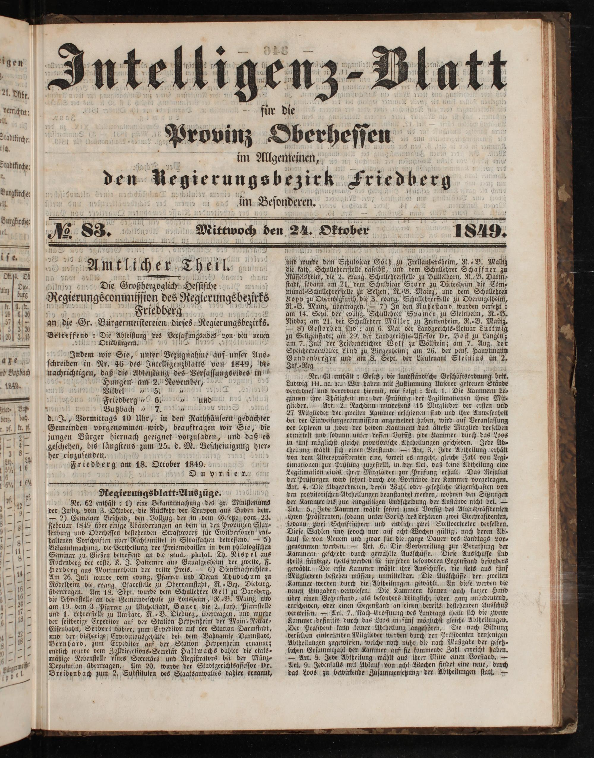 Nr. 62 enthält: 1) eine Bekanntmachung des gr. Miniſteriums der Juſtiz, vom 3. Oktober, die Rückkehr der Truppen aus Baden betr. — 2) Gemeiner Beſcheid, den Vollzug der in dem Geſetze vom 23. Februar 1849 über einige Abänderungen an dem in den Provinzen Star⸗ kenburg und Oberheſſen beſtehenden Strafproceß für Civilperſonen ent- haltenen Vorſchriften über Rechtsmittel in Strafſachen betreffend.— 5) Bekanntmachung, die Vertheilung der Preismedaillen in dem philologiſchen Seminar zu Gießen betreffend an die stud. philol, Th. Nispel aus Rockenberg der erſte, K. J. Hattemer aus Gaualgesheim der zweite, F. Herberg aus Mommenheim der dritte Preis.— 6) Dienſtnachrichten. Am 26. Juli wurde dem evang. Pfarrer und Decan Thudichum zu Rödelheim die evang, Pfarrſtelle zu Oberramſtadt, R.⸗Bez. Dieburg, übertragen. Am 18. Sept. wurde dem Schullehrer Geil zu Darsberg, die Lehrerſtelle an der Gemeindeſchule zu Lonsheim, R.-B. Mainz, und am 19. dem 3 Pfarrer zu Michelſtadt, Bauer die 2. luth. Pfarrſtelle und 1. Lehrerſtelle zu Umſtadt, R.⸗B. Dieburg, übertragen, und wurde der ſeitherige Expeditor auf der Station Heppenheim der Main-Neuar⸗ Eiſenbahn, Seibert dahier, zum Expeditor auf der Station Darmſtadt, und der bisherige Expeditionsgehülfe bei dem Bahnamte Darmſtadt, Bernhard, zum Expeditor auf der Station Heppenheim ernannt; endlich wurde dem n Hallwachs dahier die etats⸗ mäßige Nebenſtelle eines Secretärs und Regiſtrators bei der Münz⸗ Deputation übertragen. Am 20. wurde der Stadtgerichtsaſſeſſor Dr. Breidenbach zum 2. Subſtituten des Stgatsanwaltes dahier ernannt,