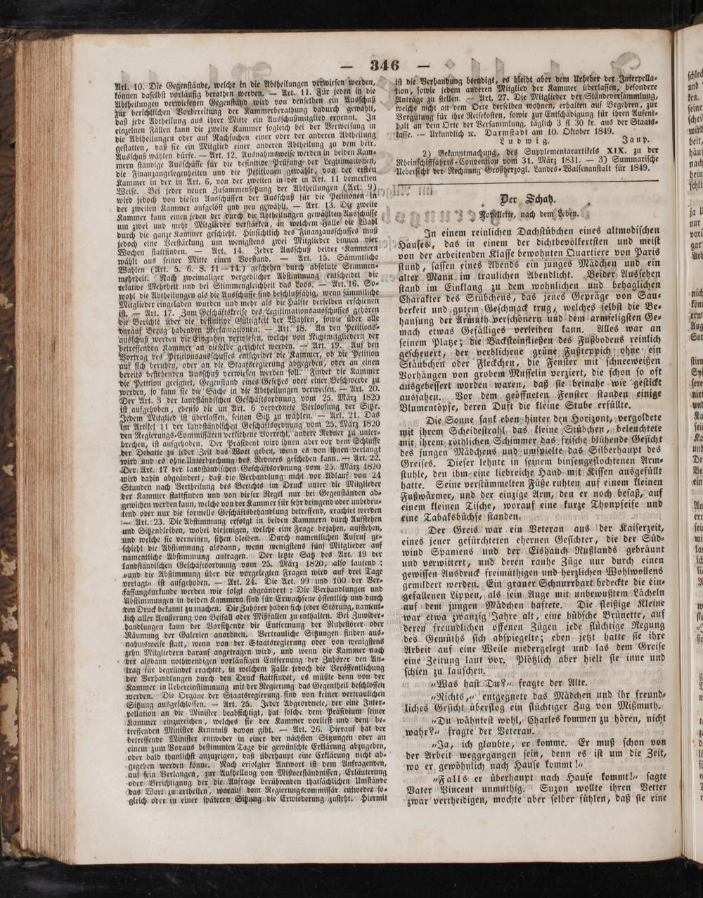 Vergütung für ihre Reiſekoſten, ſowie zur Entſchädigung für ihren Aufent⸗ halt an dem Orte der Verſammlung, täglich 3 fl. 30 kr. aus der Staats⸗ kaſſe.— Urkundlich e. Darmſtadt am 10. Oktober 1849. ö Ludwig. Jaup. 2) Bekanntmachung, des Supplementarartikels XIX. zu der