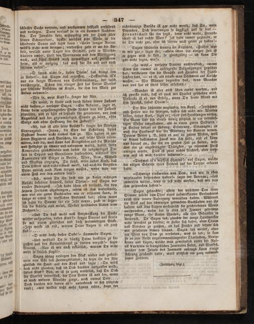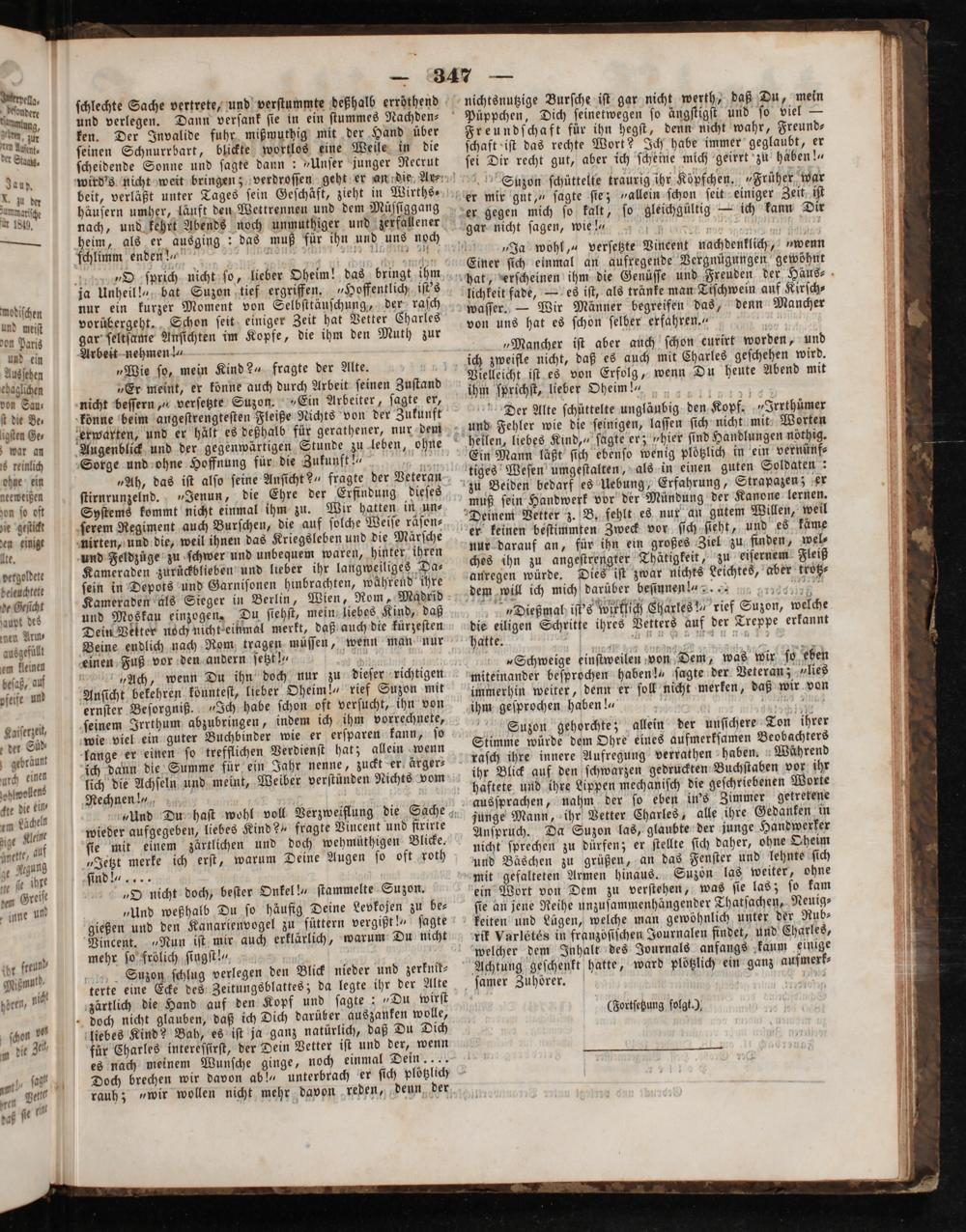 Suzon gehorchte; allein der unſichere Ton ihrer Stimme würde dem Ohre eines aufmerkſamen Beobachters raſch ihre innere Aufregung verrathen haben. Während ihr Blick auf den ſchwarzen gedruckten Buchſtaben vor ihr haftete und ihre Lippen mechaniſch die geſchriebenen Worte ausſprachen, nahm der ſo eben in's Zimmer getretene junge Mann, ihr Vetter Charles, alle ihre Gedanken in Anſpruch. Da Suzon las, glaubte der junge Handwerker nicht ſprechen zu durfen; er ſtellte ſich daher, ohne Oheim und Bäschen zu grüßen, an das Fenſter und lehnte ſich mit gefalteten Armen hinaus. Suzon las weiter, ohne ein Wort von Dem zu verſtehen, was ſie las; ſo kam ſie an jene Reihe unzuſammenhängender Thatſachen, Neuig⸗ keiten und Lügen, welche man gewöhnlich unter der Rub⸗ rik Varlétés in franzöſiſchen Journalen findet, und Charles, welcher dem Inhalt des Journals anfangs kaum einige