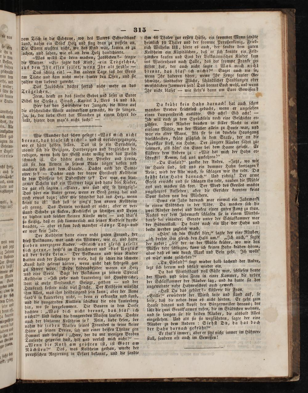 Der Kolbheim hatte einen recht guten Freund, der hieß Volkmann, war auch ein Wittwer, wie er, und hatte ſieben unerzogene Kinder. Gleich und gleich geſellt ſich gerne,“ heißt's im Sprüchwort und das Unglück üſt der beſte Leim, Der Volkmann und ſeine Kinder hatten auch der Faſttage ſo viele, daß ſie ſchier die ſchwere Kunſt bald gelernt hätten, wenn nicht das Lehrgeld gar zu ſchwer wäre. Beide Leidensbrüder waren ein Herz und eine Seele. Sagt der Volkmann zu ſeinem Special Kolbheim:„Ich ziehe nach Lauterberg ins Hanövriſche; dort iſt mehr Verdienſt.“ Geſagt, gethan— und der Hausrath koſtete nicht viel Fracht. Der Kolbheim wünſcht ihm Alles, was ihm heilbringend ſein kann; aber der Arme fand's in Lauterberg nicht,— denn er erkrankte und ſtarb, und die hungernden Kindlein ſchickten die von Lauterberg hin, wo ſie hergekommen. Die Bauern in dem Dorfe dachten:„Was dich nicht brennt, das blaſ' ich nicht!“ Und ließen die hungernden Waiſen laufen. Dachte auch der blutarme Kolbheim ſo? Nein, liebe Leſer, der nahm die ſieben Waiſen ſeines Freundes in ſeine kleine Hütte zu ſeinen Dreien, ſah mit einer heißen Thräne gen Himmel und ſeufzte:„Herr, der du mit wenigen Broden Tauſende geſpeiſet haſt, hilf und verlaß mich nicht!““— „Wenn die Noth am größten iſt, iſt Gott am Nächſten!“ Das, was Kolbheim gethan, wurde der preußiſchen Regierung in Erfurt bekannt, und die ſandte
