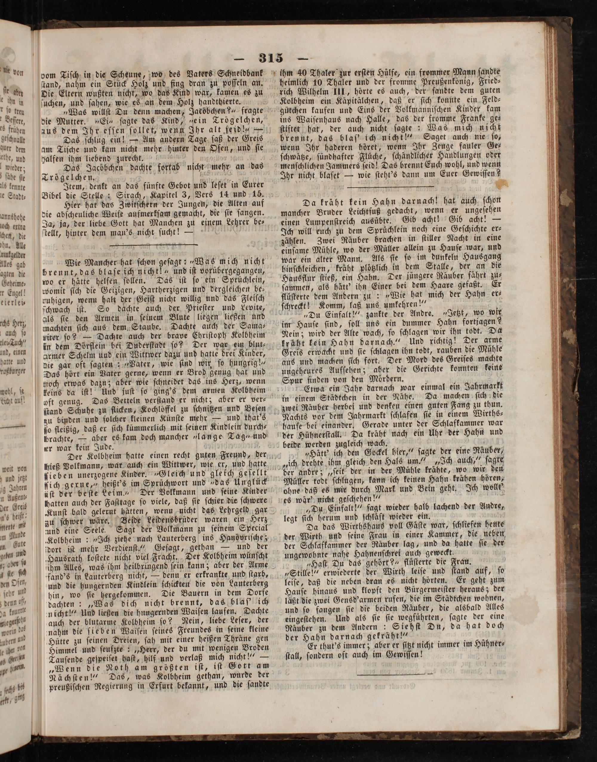 „Haſt Du das gehört?“ flüſterte die Frau. „Stille!“ erwiederte der Wirth leiſe und ſtand auf, ſo leiſe, daß die neben dran es nicht hörten. Er geht zum Hauſe hinaus und klopft den Bürgermeiſter heraus; der läßt die zwei Gensd'armen rufen, die im Städtchen wohnen, und ſo fangen ſie die beiden Räuber, die alsbald Alles eingeſtehen. Und als ſie ſie wegführten, ſagte der eine Räuber zu dem Andern: Siehſt Du, da hat doch der Hahn darnach gekräht!“