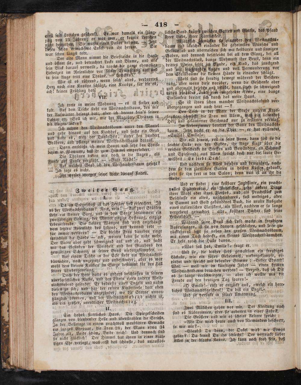 uf. 3 weiter Gan g. Aile aun nme sf ee en In 1209 1¹ Jun 71% b men 0 11 widt 10„1 0%¼% 9 901 d Da Um Erdgeſchoß iſt das Fenſter hell erleuchtet. Iſt es der Weihnachtsbaum? Neitt, fein 1.—Ailf zwet Stühten ſteht ein kleiner Sarg, und in dem Sarge ſchlummert ein zweijähriger Liebling, der Mutter einzige Hoffnung, einzige Lebensfreude. Die kleinen Wangen fd indch angehaugt des Lebens, und dennoch todt— für immer verloren!— Die bleiche Frau daneben ringt ſprachlos die Hände— ach, weinen kann ſie nicht mehr. Der Vater aber geht ſchweigend auf und ab, und ſucht mit den Gründen der Weisheit und des Glaubens den gewaltigen Schmerz in ſeiner Bruſt niederzukämpfen.— an Auf einem Tiſche in der Ecke ſteht ein Weihnachts⸗ bäumchen, noch ungeputzt und unbeſchwert, aber es war wohl dem kleinen Knaben im Sarge beſtimmt fuͤr den Fall ſeiner Wiedergeneſung, ann 2 Doch der Herr hatte es anders beſchloſſen in ſeinem unerforſchlichen Rathe, und den Eltern einen andern Weih⸗