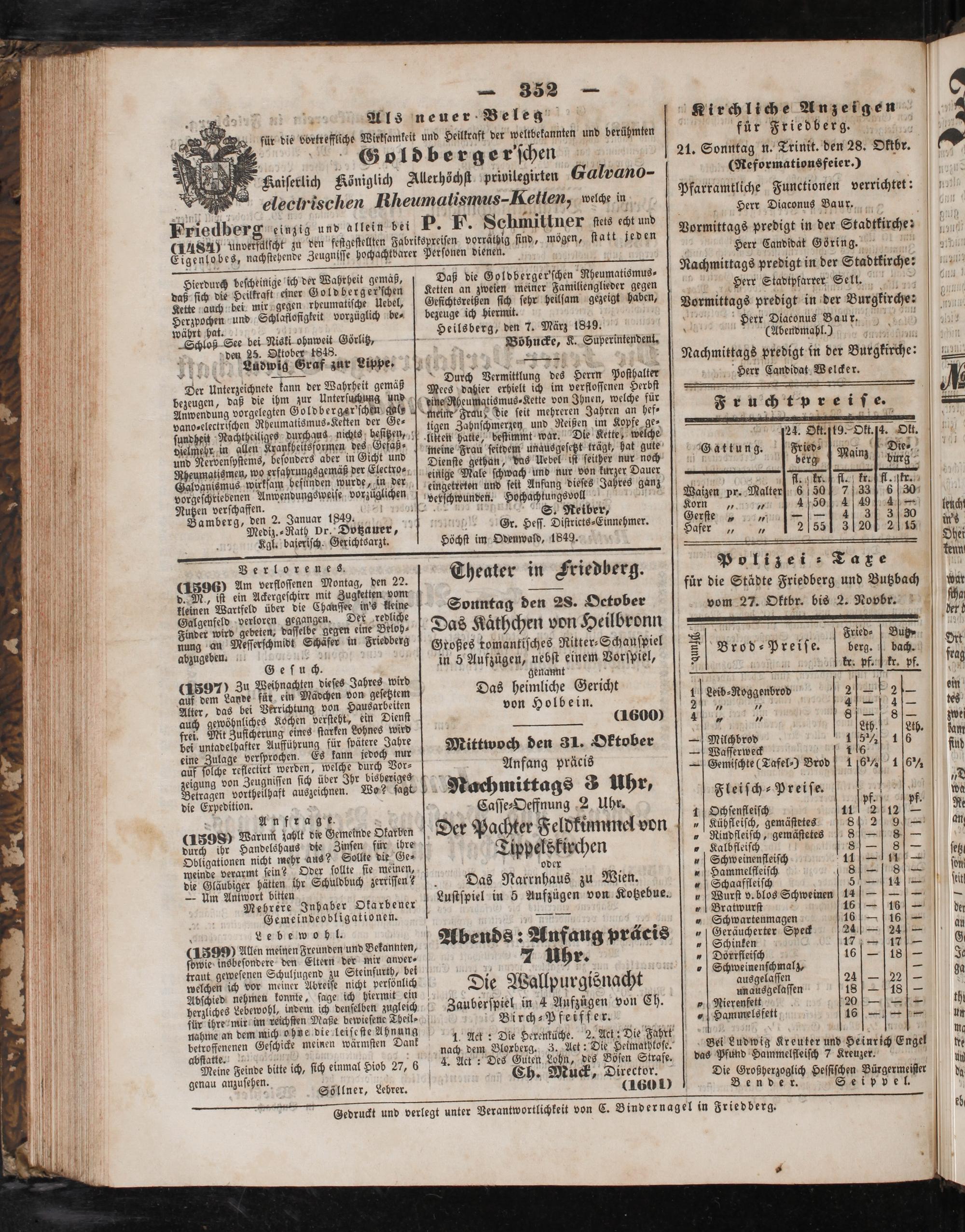 Gal ld verloren gegangen. Der redliche 2 1 Sante e 15 0 e Das Kaͤthchen von Heilbronn a an Meſſerſchmi er in Friedberg 5 14 5 E 8 2 5 8 abzugeben.* Großes tomantiſches Ritter⸗Schauſpiel[ 2 Brod ⸗Preiſe. ber— Ge ſ u ch in 5 Aufzügen, nebſt einem Vorſpiel, 1 5 1 5 a di' genannt 2 1 pf. kr. pf. ) Zu Weihnachten dieſes Jahres wird 8288 5 5 f f 8 Lande füt ein Mädchen von, geſetztem Das heimliche Gericht 1 Leib⸗Roggenbrod 2041f5 2 Alter, das bei Verrichtung von Hausarbeiten von Holbein. 2 7 5 A4 auch gewöhnliches Kochen verſteht, ein Dienſt(4600 Su! 5 8 frei. Mit Zuficherung eines ftarten eoßnes ware f—— 8 90 80 bei untadelhafter Aufführung für ſpätere Jahre Mittwoch den 31. Oktober—Milchbrod 19.6 5 eine Zulage verſprochen. Es kann jedoch nur 8— Waſſerweck 16 aüf ſolche reſleklrt werden, welche durch Nor Anfang präcis Gemischte(Tafel⸗) Brod 146% 1% eigung von Zeugniſſen ſich über Ihr bisheriges“ N itt 8 3 uh 3 auszeichnen. Wo? ſagt achmi ag 1, Fleiſch⸗Preiſe. 90 die Expedition. 5 Caſſe⸗Oeffnung 2 Uhr. pf. pf. n Anfrage. f f 25 1 Ochſenfleiſch 111 2112— (480880 Wan unt an Senne ene Der Pachter Feldkuͤmmel von eee ee 8 8 du ihr Handelshaus die inſen für ihre 5 flv.* iſch, ete 8. en nicht mehr aus? Sollte die Ge⸗ Tippelskirchen„ Kalbfleiſch 8 meinde verarmt ſein? Oder ſollte ſie meinen, oder„ Schweinenfleiſch 1 6— 1— die a 210 1 5 ihr Schuldbuch zerriſſen?. Das Narrnhaus zu Wien. 2 8 5 12 5— — Um Antwort bitten Ad 5 i N 5 225 Wee State Horterer Luſtſpiel in 5 Aufzügen von Kotzebue.„ Sean Swen 15 9 2 emeindeobligationen.— A 4 b Schwartenmagen 1616-116 1 Lebe wohl. 5 2 2 5 Gera 10 1 J. 2 Un Allen meinen Freunden und Bekannten, Abends 7 Anfang präcis 1 e r Spe 3 75 5 pwie insbeſondere den Eltern der mir anver⸗ + Uhr.„ Dörrſieiſch 46 traut geweſenen Schuljugend zu Steinfurth, bet 5.„ Schweinenſchmalz, 85 e eee Die Wallpurgisnacht augen 18 38— ied. r 5 a l elaſſen 2— herziches Lebewohl, indem ich denſelhen zugleich Zauberſpiel in 4 Aufzügen von Ch. 11 1 5 8 — 3 N. e 3 Birch⸗Pfeiffer.„ Hammelsfett 16——— nahme an dem mi e die leiſeſte Ahnung K e e e e e 7 ae e ee Dang 105 3 8 l See Bei Ludwig Kreuter und Heinrich Engel ag ene gel itte ich, ſich einmal Hiob 27, 4. Act: Des Guten Lohn, des Böſen Strafe. das Pfund Hammelfleiſch 7 Kreuzer. 5 Meine Feinde bitte ich, ſich einmal Hiob 27, 6 Ch Muck, Director. 752 0 3 N 5*. roßherzoglich Heſſiſchen Bürgermeiſter genau anzuſehen Söllner, Lebrer. 1805 4. cdlic ig 1 15 1 15