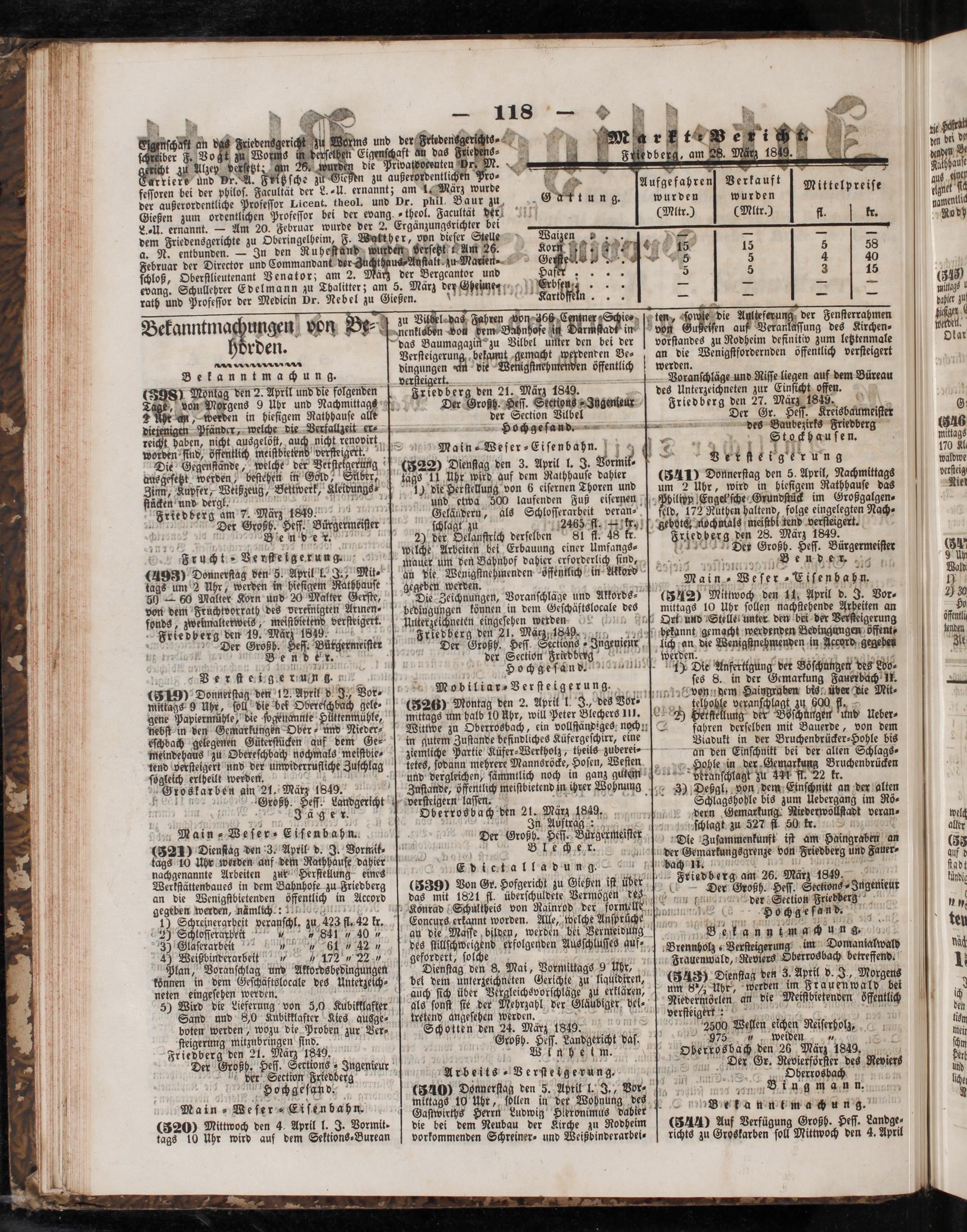 Friedberg den 28. März 1849. Der Großh. Heſſ. Bürgermeiſtet 210 420 ll 8 e. d dig u Main. Weſer„Eiſenbahn. (542) Mittwoch den 11, April d. J. Vor⸗ mittags 10 Uhr ſollen nachſtehende 1 an Ont und Stelle unter den bei der igerung