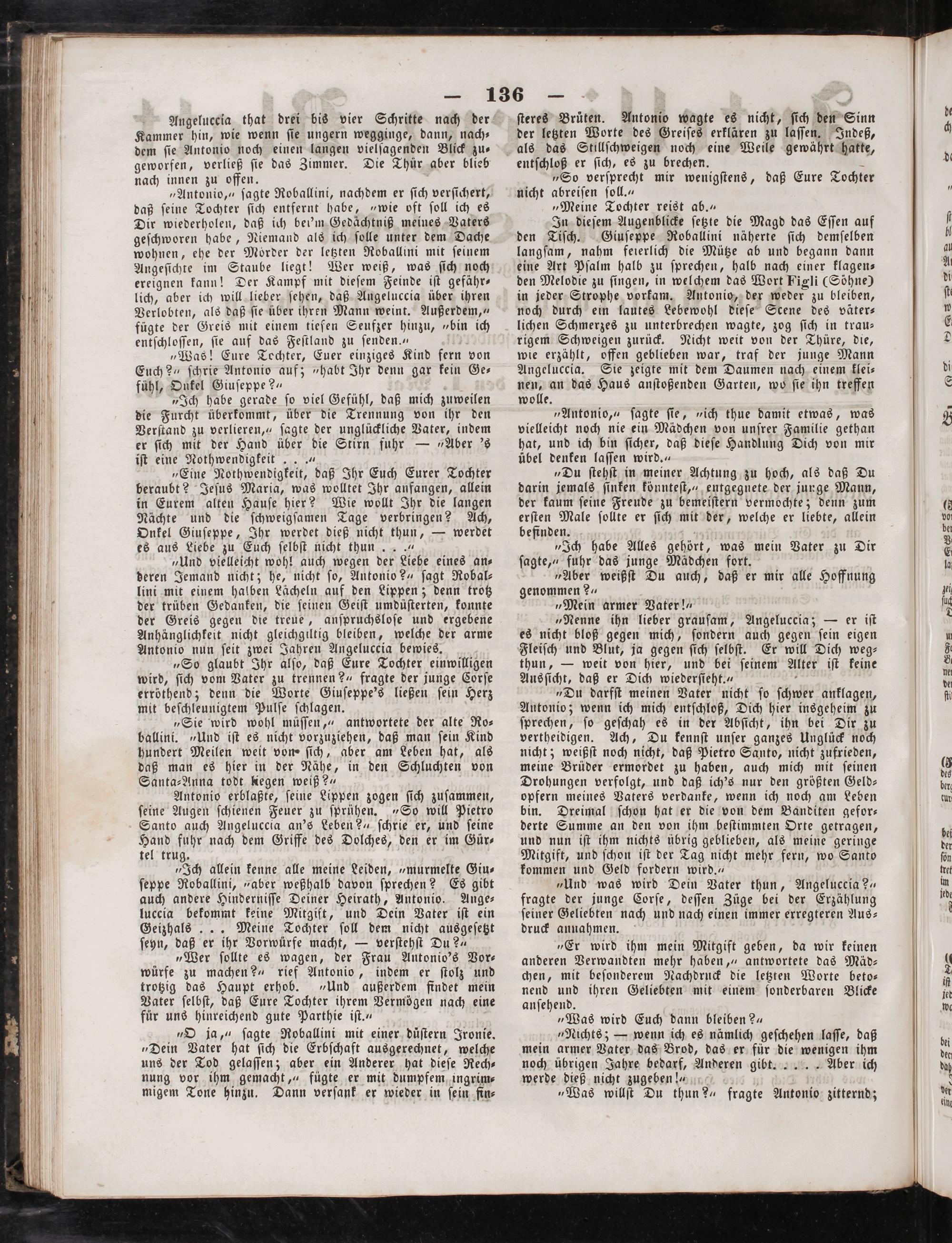 „Du darfſt meinen Vater nicht ſo ſchwer anklagen, Autonio; wenn ich mich entſchloß, Dich hier insgeheim zu ſprechen, ſo geſchah es in der Abſicht, ihn bei Dir zu vertheidigen. Ach, Du kennſt unſer ganzes Ungluͤck noch nicht; weißſt noch nicht, daß Pietro Santo, nicht zufrieden, meine Brüder ermordet zu haben, auch mich mit ſeinen Drohungen verfolgt, und daß ich's nur den größten Geld— opfern meines Vaters verdanke, wenn ich noch am Leben bin. Dreimal ſchon hat er die von dem Banditen gefor— derte Summe an den von ihm beſtimmten Orte getragen, und nun iſt ihm nichts übrig geblieben, als meine geringe Mitgift, und ſchon iſt der Tag nicht mehr fern, wo Santo kommen und Geld fordern wird.“