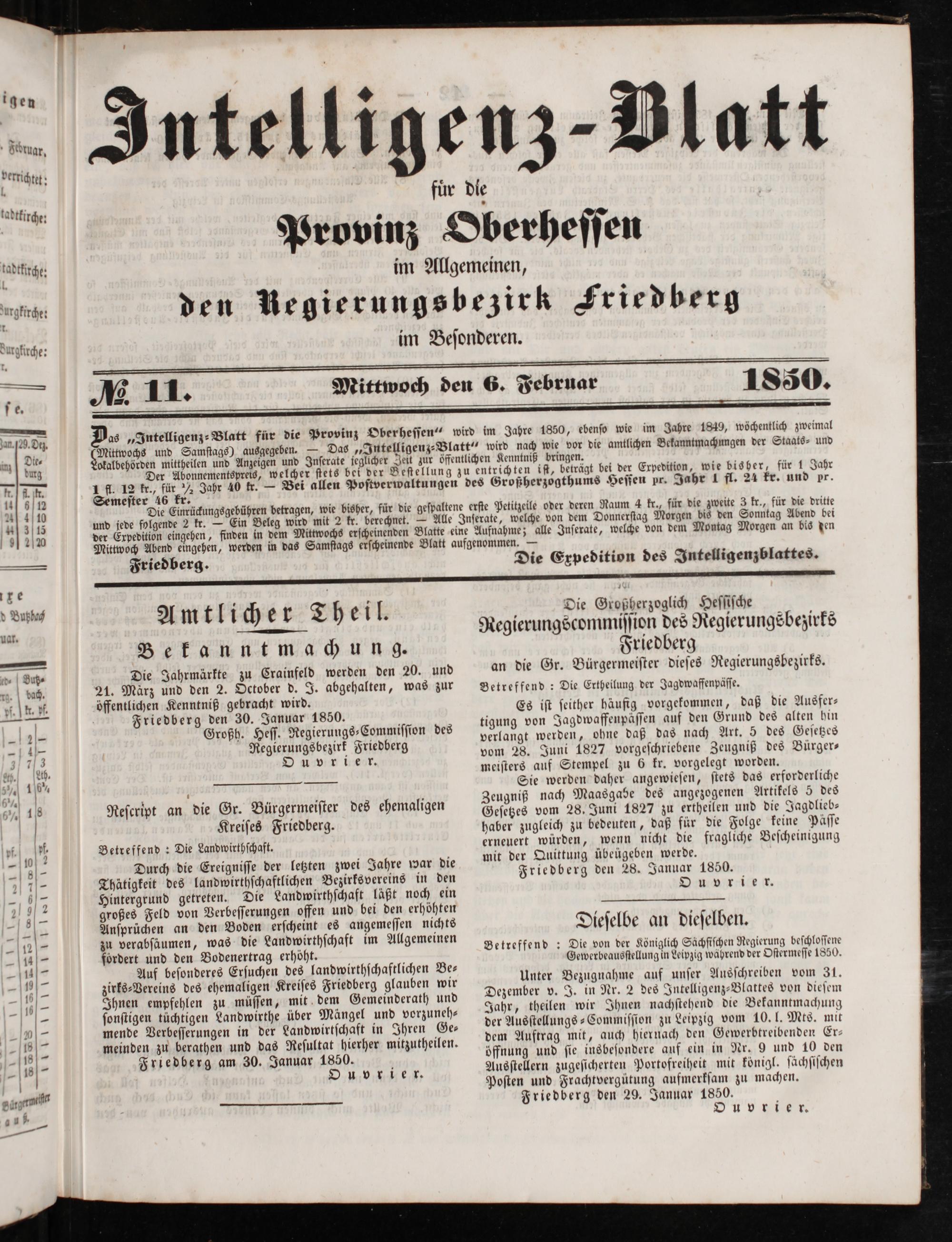 Das„Intelligenz⸗Blatt für die Provinz Oberheſſen“ wird im Jahre 1850, ebenſo wie im Jahre 1849, wöchentlich zweimal 0 85 1 85 und Samſtags) ausgegeben.— Das„Jutelligenz⸗Blatt“ wird nach wie vor die amtlichen Bekanntmachungen der Staats⸗ und