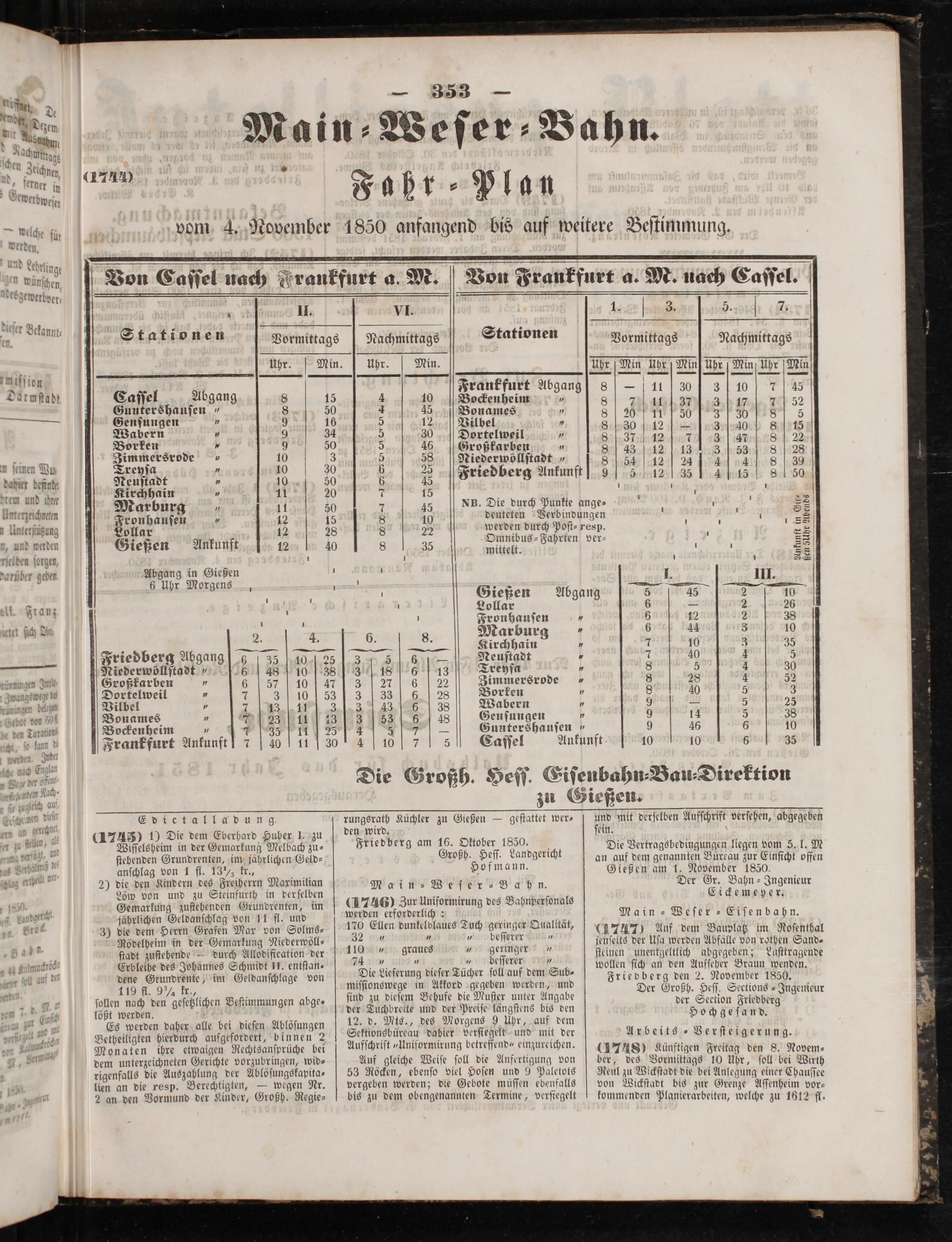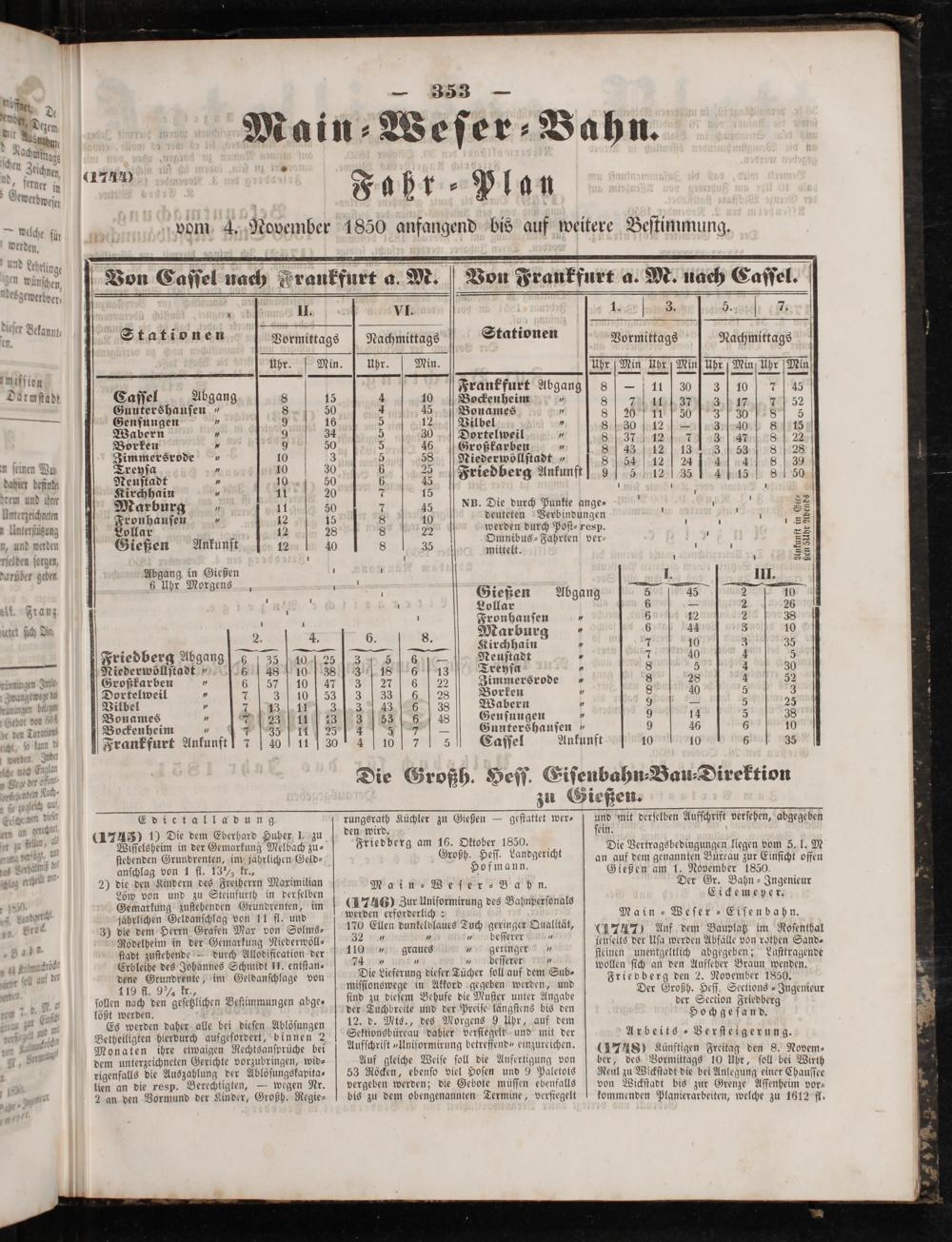 (1747) Auf dem Bauplatz im Roſenthal jenſeits der Uſa werden Abfälle von rothen Sand- ſteinen unentgeltlich abgegeben; Luſttragende wollen ſich an den Aufſeher Braun wenden. Friedberg den 2. November 1850. Der Großh. Heſſ. Seetions-Ingenieur der Section Friedberg Hochgeſand.