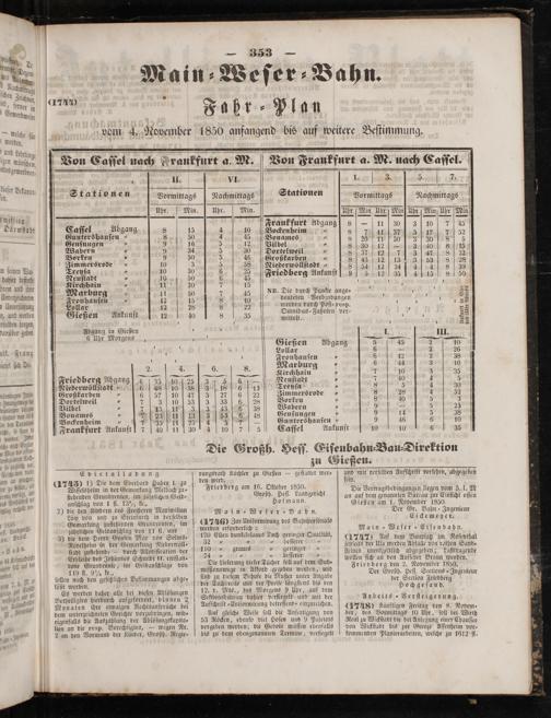 r 2. Von Caſſel nach Frankfurt a. M. Von Frankfurt a. M. uach Caſſel. II. VI. 1. 8. 5. 77 Stationen Vormittags[Nachmittags Stationen Vormittags Nachmittags uhr. Min.] Uhr. Min. Abr Nin Uhr Nin übe Min U Na. Frankfurt Abgang, 8— 30 7 45 Caſſel. Abgang 8 15 4 10 Vece 5 8 7 1 3 5 5 1 52 Guntershauſen„ 8 50 4 45 Bonames 1 8 20 111 30 3 308 5 Genſungen„ 9 16 5 12.[Vilbel 5 8 3012 leb 15 Wabern„ 9 34 5 30 Dortelweil„ 8 37 12 5 3 a0 22 Borken 7 9 50 5 46 Großkarb 5 e 5 42 814521 2 9 ßkarben 8 43 1213 3.58 8 28 Zimmersrode 10 3 5 58 Niederwöllſtadt ⸗ 8 54 12 24 14144 8 39 Treyſa 1 10 30 6 25 Friedber Ankunft F* 1. 15 Neuſtadt. 10 50 6 45 8 N et e ect g d san Kirchhain„ 11 20 7 15 8 l u Marburg 1 11 50— 45 NB. Die durch Punkte ange⸗ a 2 2 Fronhauſen 5 12 15 8 10 deuteten Verbindungen 5 f 1 25 Lollar 12 28 8 22 2 durch Poſt⸗ resp. 3 2 195 1 15 mnibus⸗Fahrten ver⸗ 2 Gießen Ankunft 2 0 s 35. rer 755 1 55 Abgang 5 Gießen l 1 III 6 Uhr orgens 1 1 7————— N— f 8 a Gießen Abgang 5 45 2 10 a 5 i Lollar 6— 2 26 ö i f a Fronhauſen 7 6 12 2 38 2 4 6 8 Marburg 7 6 44 3 10 1 ä 5 Kirchhain„ 7 10 3 35 Friedberg Abgang] 35 10 25 3 5 6— Neuſtadt. 7 40 4 5 Niederwöllſtadt/ 6 4810 38 318 6 13 Treyſa„ 8 5 4 3⁰ Großkarben„ 5 i i en 22 Zimmersrode- 8 28 4 52 Dortelweil 7 7310 53 333 6 28 Borken 1 8 40 5 3 Vilbel„ 7 3 11 3343038 Wabern 9 9— 5 25 Bonames„ 23114 3 53 6. 48 Genſungen 9 14 5 38 Bockenheim 1 17 35 1125 4 2— Guntershauſen„ 5 46 6 10 Frankfurt Ankunft] 7 4011 30 f 4107 5 Caſſel Ankunft 10 10 6 35