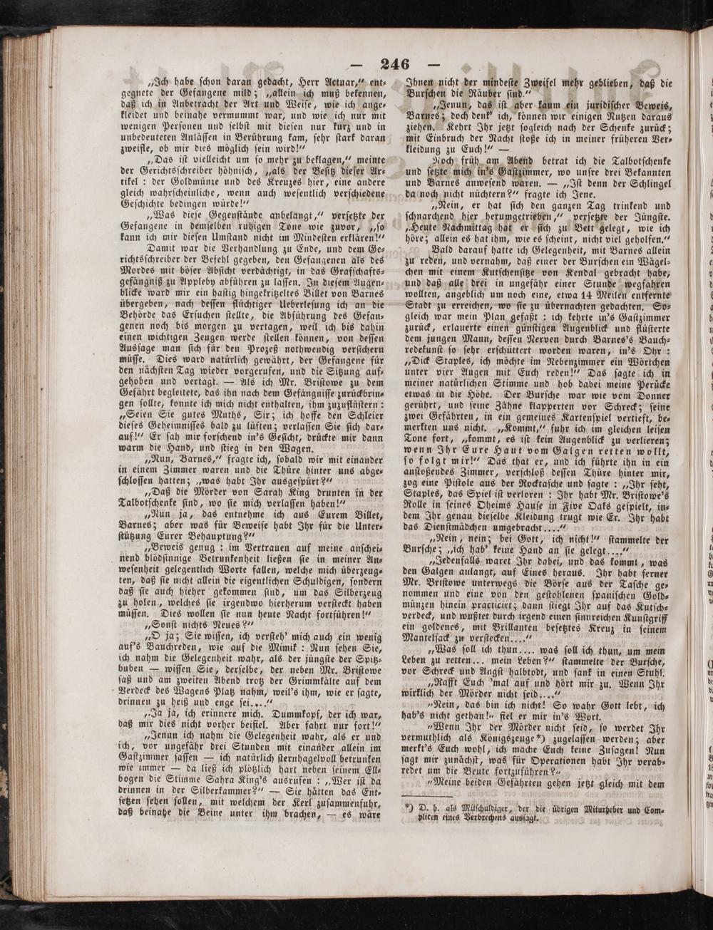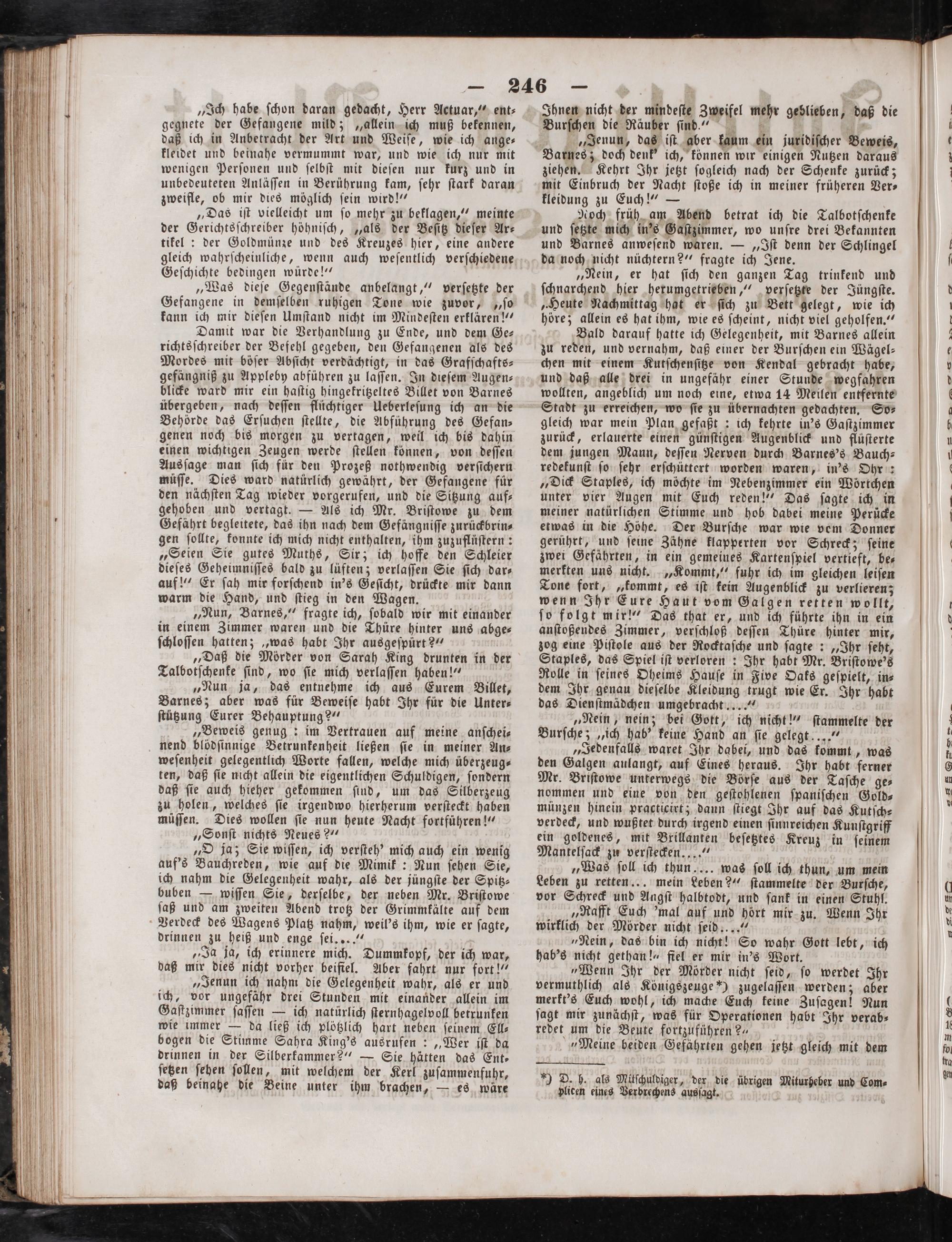 Damit war die Verhandlung zu Ende, und dem Ge— richtsſchreiber der Befehl gegeben, den Gefangenen als des Mordes mit böſer Abſicht verdächtigt, in das Grafſchafts— gefängniß zu Appleby abführen zu laſſen. In dieſem Augen⸗ blicke ward mir ein haſtig hingekritzeltes Billet von Barnes übergeben, nach deſſen flüchtiger Ueberleſung ich an die Behörde das Erſuchen ſtellte, die Abführung des Gefan— genen noch bis morgen zu vertagen, weil ich bis dahin einen wichtigen Zeugen werde ſtellen können, von deſſen Aus ſage man ſich für den Prozeß nothwendig verſichern müſſe. Dies ward natürlich gewährt, der Gefangene für den nächſten Tag wieder vorgerufen, und die Sitzung auf⸗ gehoben und vertagt.— Als ich Mr. Briſtowe zu dem Gefährt begleitete, das ihn nach dem Gefängniſſe zurückbrin⸗ gen ſollte, konnte ich mich nicht enthalten, ihm zuzuflüſtern: „Seien Sie gutes Muths, Sir; ich hoffe den Schleier dieſes Geheimniſſes bald zu lüften; verlaſſen Sie ſich dar⸗ auf!“ Er ſah mir forſchend in's Geſicht, drückte mir dann warm die Hand, und ſtieg in den Wagen.
