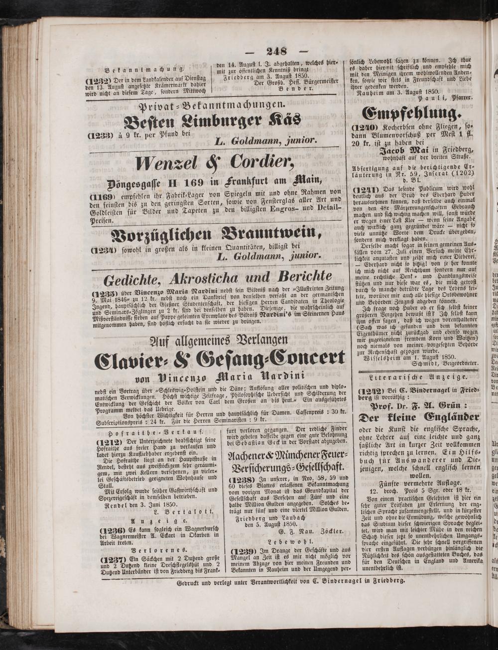 Gedruckt und verlegt unter Verantwortlichkeit von C. Bindernagel in Friedberg.