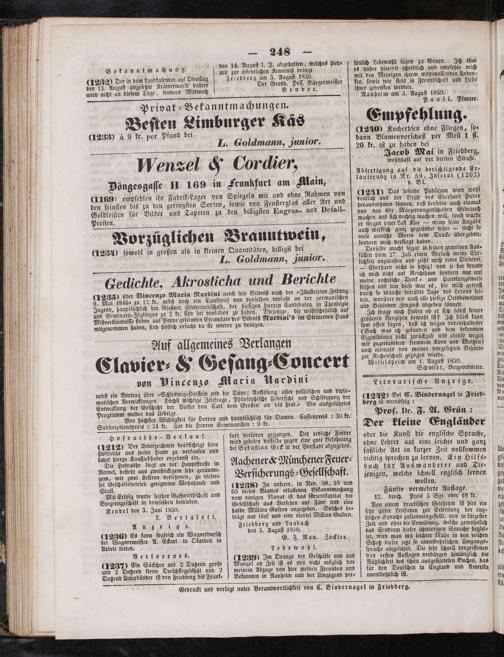 9. Mai 1846 zu 12 kr. nebſt noch ein Dankbrief von denſelben verfaßt an der germaniſchen Ingend, hauptſächlich der Gießner Studentenſchaft, der hieſigen Herren Candidaten in Theologie 2 kr. ſind bei denſelben zu haben. Diejenige, die wahrſcheinlich auf Mißverſtändniſſe ſieben auf Pappe geleimten Exemplare des Bildniß Nardini's im Steinernen Haus mitgenommen haben, ſind höflich erſucht da ſie wieder zu bringen.