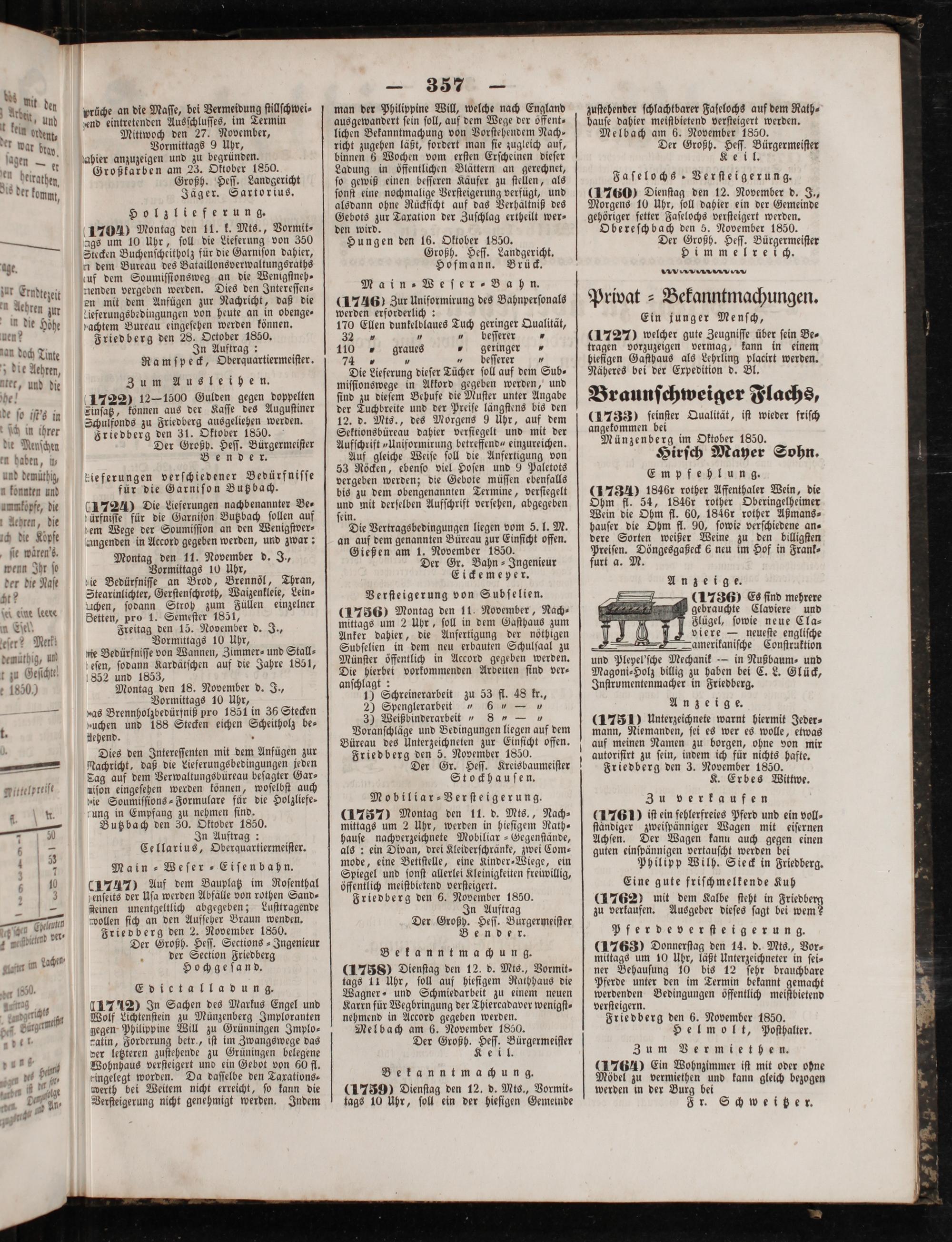 Hirſch Mayer Sohn. Empfehlung. (1730 184fr rother Affenthaler Wein, die Ohm fl. 54, 1846 r rother Oberingelheimer Wein die Ohm fl. 60, 18461 rother Aßmans⸗ hauſer die Ohm fl. 90, ſowie verſchiedene an⸗ dere Sorten weißer Weine zu den billigſten Preiſen. Döngesgaßeck 6 neu im Hof in Frank⸗ furt a. M Anzeige. (17360 Es ſind mehrere gebrauchte Claviere und F Flügel, ſowie neue Cla⸗ Jviere— neueſte engliſche 2.—amerikaniſche Conſtruktion und Plepel'ſche Mechanik— in Nußbaum⸗ und Magoni⸗Holz billig zu haben bei C. L. Glück, Inſtrumentenmacher in Friedberg. Anzeige. (1751) Unterzeichnete warnt hiermit Jeder⸗ mann, Niemanden, ſei es wer es wolle, etwas auf meinen Namen zu borgen, ohne von mir autorifirt zu ſein, indem ich für nichts hafte. Friedberg den 3. November 1850. K. Erbes Wittwe.