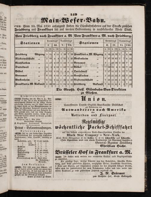 20 Vom 10. Mai 1850 anfangend finden die Eiſenbahnfahrten auf der Strecke zwiſchen Friedberg und Frankfurt bis auf weitere Beſtimmung in nachſtehender Weiſe Statt.
