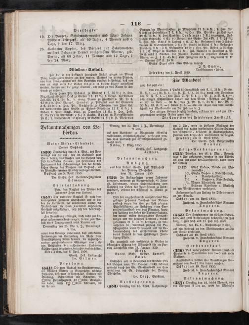 um 2 Uhr, wird in hieſigem Rathhaus der Nachlaß des dahier verſtorbenen Philipp Dämon von Hochweiſel, beſtehend in Kleidungsſtücken, Hemden und dergleichen meiſtbietend verſteigert. Friedberg am 11. April 1850. Der Großh. Heſſ. Bürgermeiſter Bender.