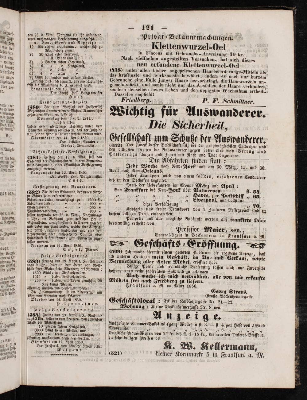 Donnerſtag den 18. d. Mts., früh e 9 Uhr, dahier gegen gleichbaare Zahlung unter dem Bemerken öffentlich verſteigern, daß der Zuſchlag um jeden Preis ſofort ertheilt werden wird. Obermörlen den 14. April 1850. Der beſtellte Curator: Riedel, Rentmeiſter.