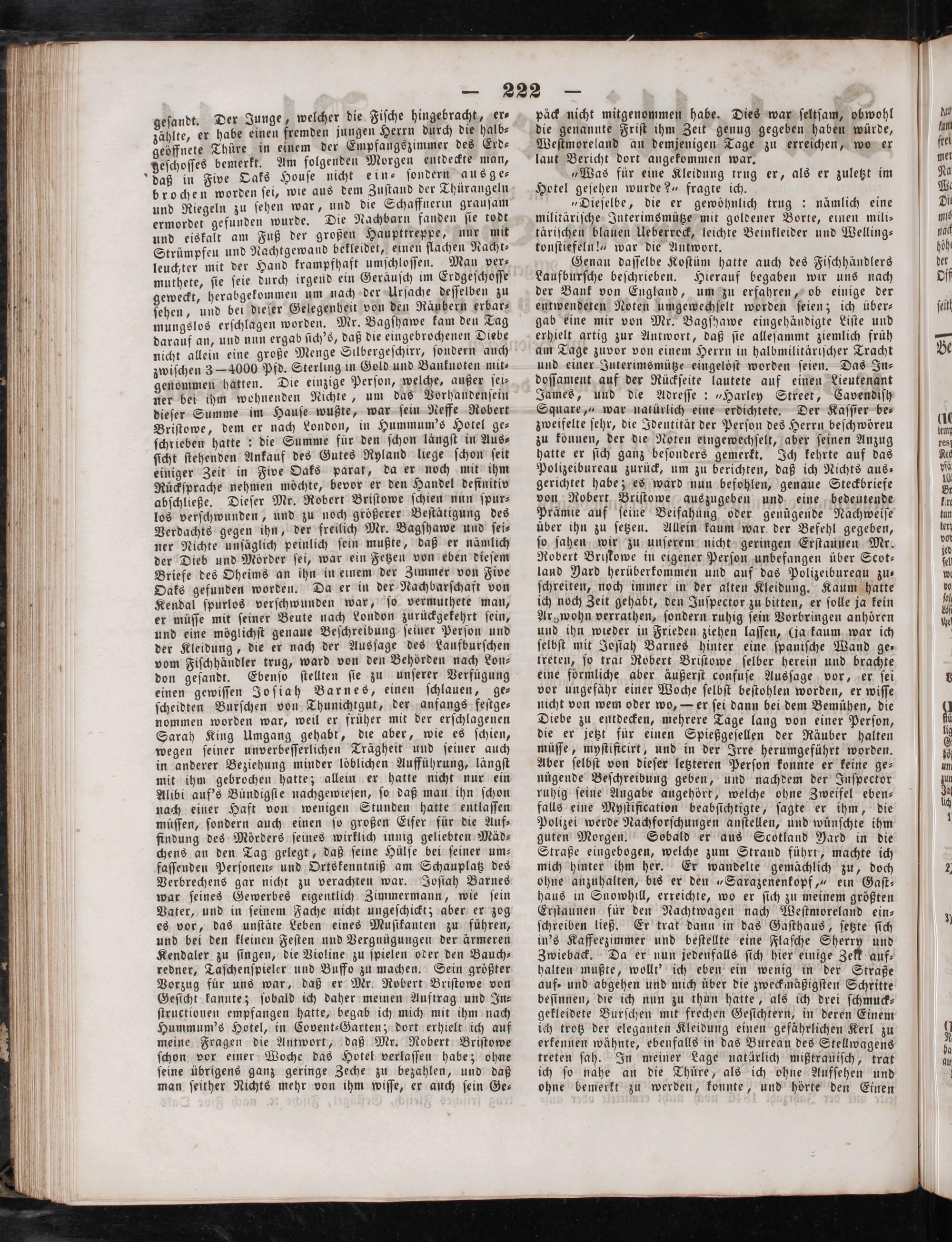 dt. Der Junge, welcher die Fiſche hingebracht, er⸗ 1 er habe 500 fremden jungen Herrn durch die halb⸗ geöffnete Thüre in einem der Empfangszimmer des Erd—⸗ geſchoſſes bemerkt. Am folgenden Morgen entdeckte man, daß in Five Oaks Houſe nicht ein- ſondern aus ge⸗ brochen worden ſei, wie aus dem Zuſtand der Thürangeln und Riegeln zu ſehen war, und die Schaffnerin grauſam ermordet gefunden wurde. Die Nachbarn fanden ſie todt und eiskalt am Fuß der großen Haupttreppe, nur mit Strümpfeu und Nachtgewand bekleidet, einen flachen Nacht- leuchter mit der Hand krampfhaft umſchloſſen. Man ver⸗ muthete, ſie ſeie durch irgend ein Geräuſch im Erdgeſchoſſe geweckt, herabgekommen um nach der Urſache deſſelben zu ſehen, und bei dieſer Gelegenheit von den Räubern erbar⸗ mungslos erſchlagen worden. Mr. Bagſhawe kam den Tag darauf an, und nun ergab ſich's, daß die eingebrochenen Diebe nicht allein eine große Menge Silbergeſchirr, ſondern auch zwiſchen 3 4000 Pfd. Sterling in Gold und Banknoten mit⸗ genommen hatten. Die einzige Perſon, welche, außer ſei⸗ ner bei ihm wehnenden Nichte, um das Vorhandenſein dieſer Summe im Hauſe wußte, war ſein Neffe Robert Briſtowe, dem er nach London, in Hummum's Hotel ge⸗ ſchrieben hatte: die Summe für den ſchon längſt in Aus⸗ ſicht ſtehenden Ankauf des Gutes Ryland liege ſchon ſeit einiger Zeit in Five Oaks parat, da er noch mit ihm Rückſprache nehmen möchte, bevor er den Handel definitiv abſchließe. Dieſer Mr. Robert Briſtowe ſchien nun ſpur⸗ los verſchwunden, und zu noch größerer Beſtätigung des Verdachts gegen ihn, der freilich Mr. Bagſhawe und ſei⸗ ner Nichte unſäglich peinlich ſein mußte, daß er nämlich der Dieb und Mörder ſei, war ein Fetzen von eben dieſem Briefe des Oheims an ihn in einem der Zunmer von Five Oaks gefunden worden. Da er in der Nachbarſchaft von Kendal ſpurlos verſchwunden war, ſo vermuthete man, er müſſe mit ſeiner Beute nach London zurückgekehrt ſein, und eine möglichſt genaue Beſchreibung ſeiner Perſon und der Kleidung, die er nach der Ausſage des Laufburſchen vom Fiſchhändler trug, ward von den Behörden nach Lon⸗ don geſandt. Ebenſo ſtellten ſie zu unſerer Verfügung einen gewiſſen Joſiah Barnes, einen ſchlauen, ge⸗ ſcheidten Burſchen von Thunichtgut, der anfangs feſtge— nommen worden war, weil er früher mit der erſchlagenen Sarah King Umgang gehabt, die aber, wie es ſchien, wegen ſeiner unverbeſſerlichen Trägheit und ſeiner auch in anderer Beziehung minder löblichen Aufführung, längſt mit ihm gebrochen hatte; allein er hatte nicht nur ein Alibi auf's Bündigſte nachgewieſen, ſo daß man ihn ſchon nach einer Haft von wenigen Stunden hatte entlaſſen müſſen, ſondern auch einen ſo großen Eifer für die Auf⸗ findung des Mörders ſeines wirklich innig geliebten Mäd— chens an den Tag gelegt, daß ſeine Hülfe bei ſeiner um— faſſenden Perſonen- und Ortskenntniß am Schauplatz des Verbrechens gar nicht zu verachten war. Joſiah Barnes war ſeines Gewerbes eigentlich Zimmermann, wie ſein Vater, und in ſeinem Fache nicht ungeſchickt; aber er zog es vor, das unſtäte Leben eines Muſikanten zu führen, und bei den kleinen Feſten und Vergnügungen der ärmeren Kendaler zu ſingen, die Violine zu ſpielen oder den Bauch⸗ redner, Taſchenſpieler und Buffo zu machen. Sein größter Vorzug für uns war, daß er Mr. Robert Briſtowe von Geſicht kannte; ſobald ich daher meinen Auftrag und In— ſtructionen empfangen hatte, begab ich mich mit ihm nach Hummum's Hotel, in Covent-Garten; dort erhielt ich auf meine Fragen die Antwort, daß Mr. Robert Briſtowe ſchon vor einer Woche das Hotel verlaſſen habe; ohne ſeine übrigens ganz geringe Zeche zu bezahlen, und daß man ſeither Nichts mehr von ihm wiſſe, er auch ſein Ge—