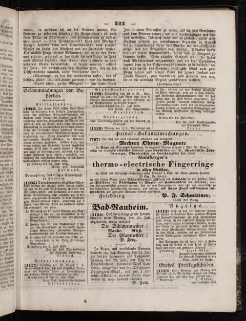 (1046) Im Jahre 1823 leiſtete Peter Bou⸗ temp in Frietberg dem hieſigen Hospitalfond, resp. der geiſtlichen Stiftungsdeputation als Rechner jenes Fonds eine Caution durch Ver- pfändung mehrerer Grundſtücke im Werthe von 1057 fl. und im Jahre 1843 ſetzte Johannes Breitenbach in Oberwöllſtadt der hieſigen Stadt- kirche eine Hofraithe wegen gehöriger Verrich tung der übernommenen Weißbinderarbeiten un⸗ terpfändlich ein. Beide Cautionen ſind nach vorliegender Anzeige erloſchen, die Urkunden jedoch verloren gegangen. Sollten dritte die⸗ ſelben beſitzen und Anſprüche daraus begründen wollen, ſo iſt dies ſo gewiß binnen 6 Wochen von heute an hier anzuzeigen, als ſonſt, daß kein ſolcher Anſpruch mehr beſtehe, unterſtellt und Löſchung der betreffenden Einträge in den Hppo⸗ thekenbüchern verfügt werden wird. Friedberg den 22. Juni 1850. Großh. Heſſ. Landgericht Hofmann.