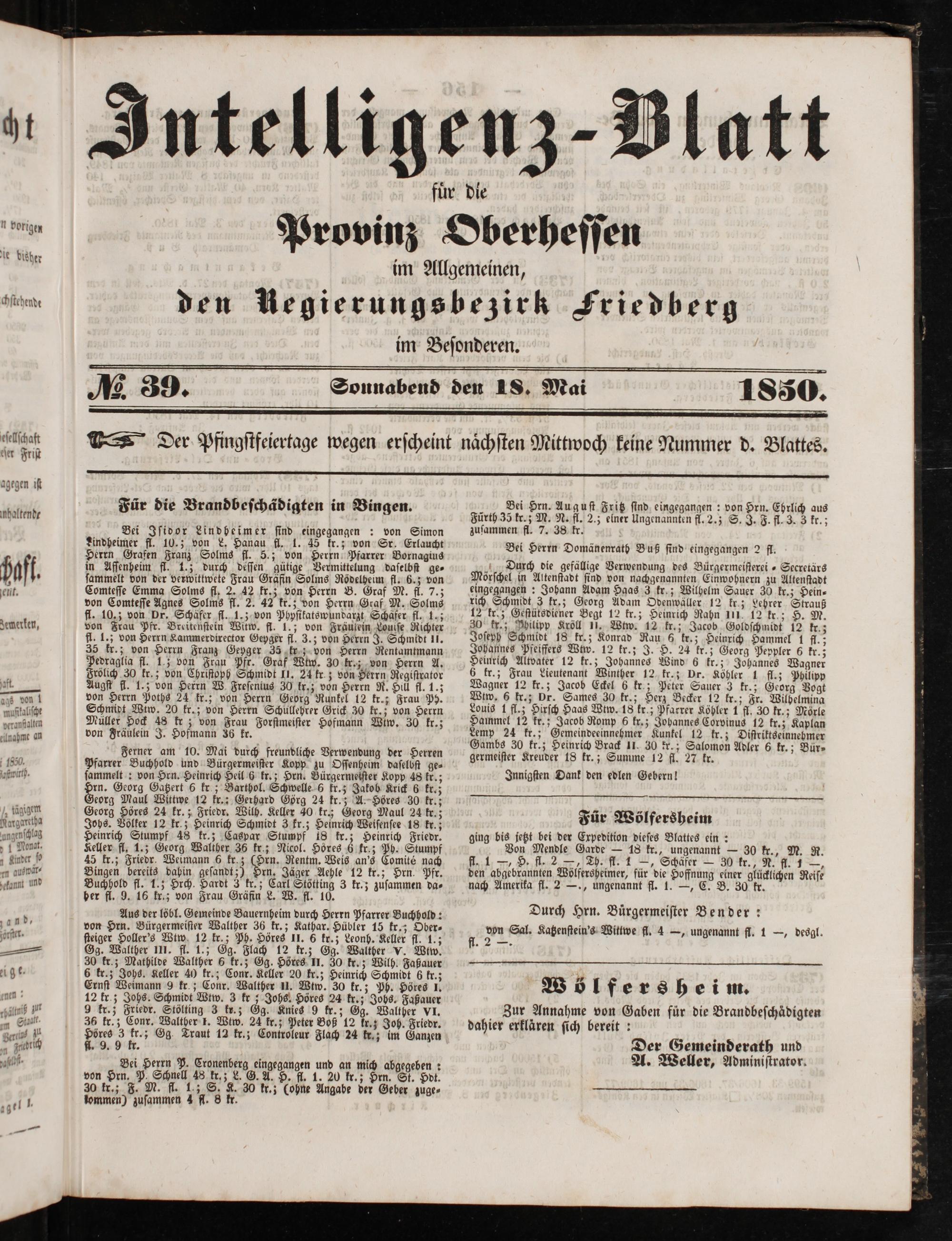 Bei Herrn P. Cronenberg eingegangen und an mich abgegeben: von Hrn. P. Schnell 48 kr.; L. G. A. H. fl. 1. 20 kr.; Hrn. St. Hdt. 30 kr.; F. M. fl. 1.; S. K. 30 kr.;(ohne Angabe der Geber zuge⸗ lommen) zuſammen 4 fl. 8 kr.