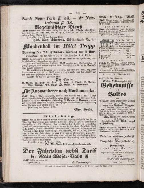 (201) Vom 1. März anfangend, werden jeden Monat den 1. und 15. ſehr ſchöne ſchnellſegelnde Dreimaſterſchiffe erſter Elaſſe, nach allen Seehäfen Nord⸗ Amerikas durch das Conſulat Lüdering& Comp. in Bremen expedirt und übernehme unter den billigſten Bedingungen Auswanderer zur Beförderung unter Garantie nach obigen Häfen an. Friedberg im Januar 1850.