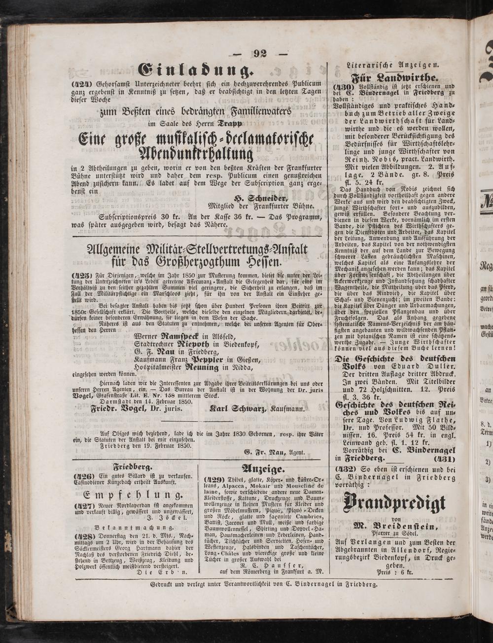 Gedruckt und verlegt unter Verantwortlichkeit von C. Bindernagel in Friedberg.