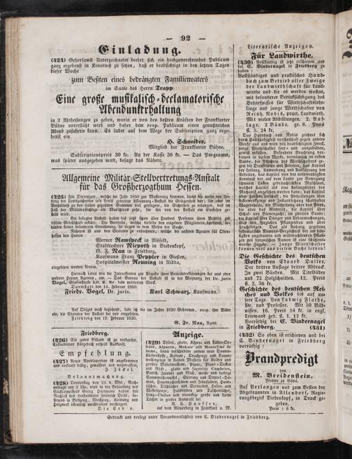 Darmſtadt den 14. Februar 1850. Friedr. Vogel, Dr. juris.