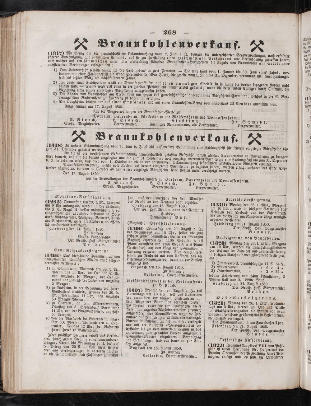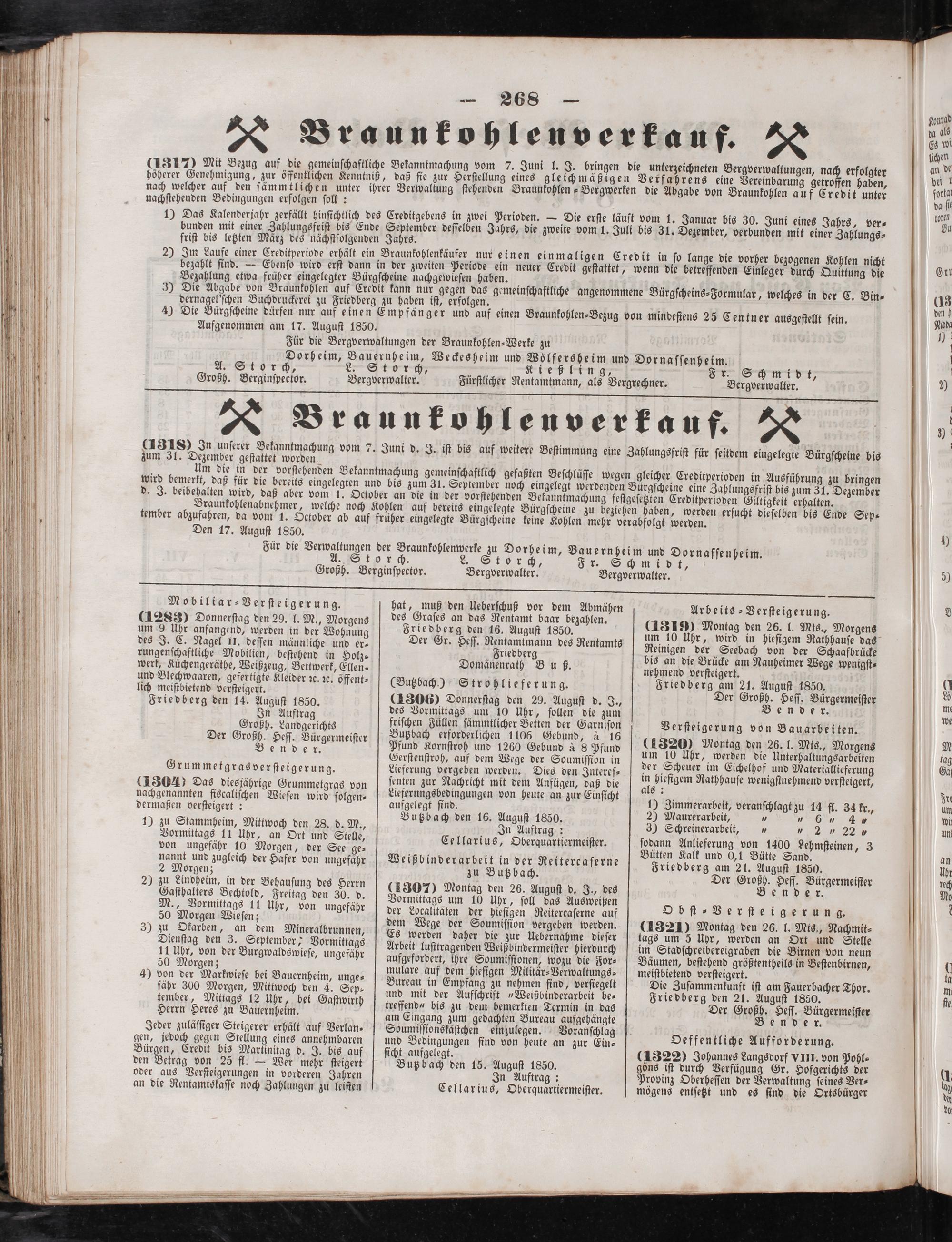 ſodann Anlieferung von 1400 Lehmſteinen, 3 Bütten Kalk und 6,1 Bätte Sand. Friedberg am 21. Auguſt 1850. Der Großh. Heſſ. Bürgermeiſter Bender.