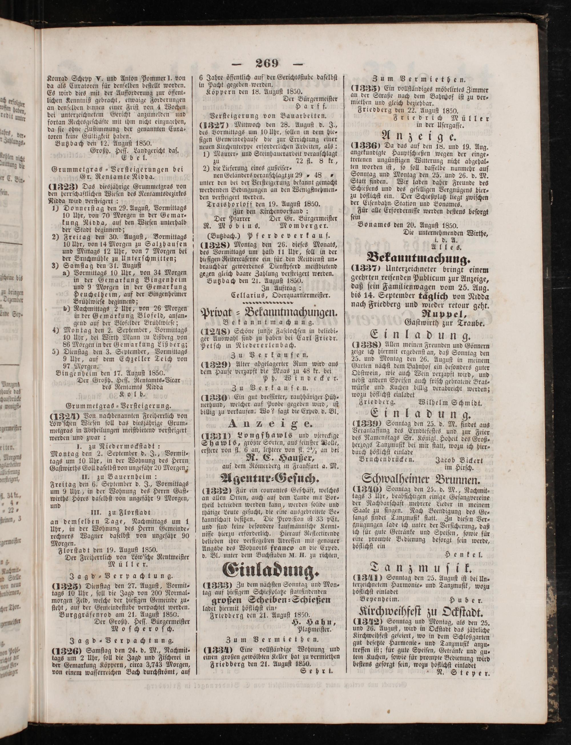 (1335) Ein vollſtändiges möbelirtes Zimmer an der Straße nach dem Bahnhof iſt zu ver⸗ miethen und gleich beziehbar. Friedberg den 22. Auguſt 1850. Friedrich Müller in der Uſergaſſe. zeige. (1336) Da das auf den 18. und 19. Aug. angekundigte Hauptſchleßen wegen der einge⸗ tretenen ungünſtigen Witterung nicht abgehal⸗ ten worden iſt, ſo ſoll daſſelbe nunmehr auf Sonntag und Montag den 25. und 26. d. M. Statt finden. Wir laden daher Freunde des Schießens und des geſelligen Vergnügens hier⸗ zu höflichſt ein. Der Schießplatz liegt zwiſchen der Eiſenbahn. Station und Bonames. 1 alle Erforderniſſe werden beſtens beſorgt ein Bonames den 20. Auguſt 1850. Die unternehmenden Wirthe, i. d. A