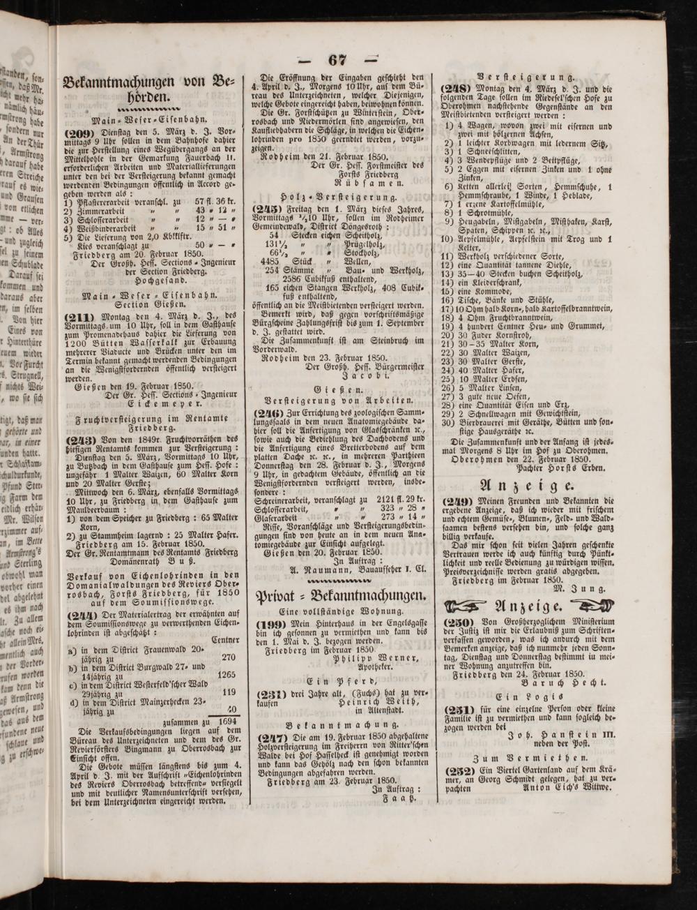 (247) Die am 19. Februar 1850 abgehaltene Holzverſteigerung im Freiherrn von Ritter'ſchen Walde bei Hof Haſſelheck iſt genehmigt worden und kann das Gehölz nach den ſchon bekannten Bedingungen abgefahren werden. Friedberg am 23. Februar 1850. In Auftrag: F a a b.