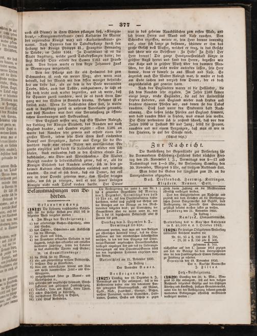 Von der Pflanze und ihr als Heilmittel bis zum Schmauchen iſt noch ein weiter Weg; aber wenn man bedenkt, daß der Menſch mit dem Affen weniger Aehnlich— keit am Leibe hat, als an dem in der Seele wohnenden Triebe, Alles, auch das Tollſte, nachzuahmen, ſo läßt es ſich doch leicht auch wieder begreifen, und ich wette, daß die Spanier zuerſt rauchten, weil ſie es durch ihren Um⸗ gang mit den Wilden in Amerika lernten. Bekannt iſt es freilich nicht. Wenn die Nachrichten ſicher ſind, ſo wurde auch in Augsburg zuerſt in unſerem Vaterlande geraucht, und dieß Rauchen war dort eine Veranlaſſung zu offent⸗ lichen Unordnungen und Volksauflauf.