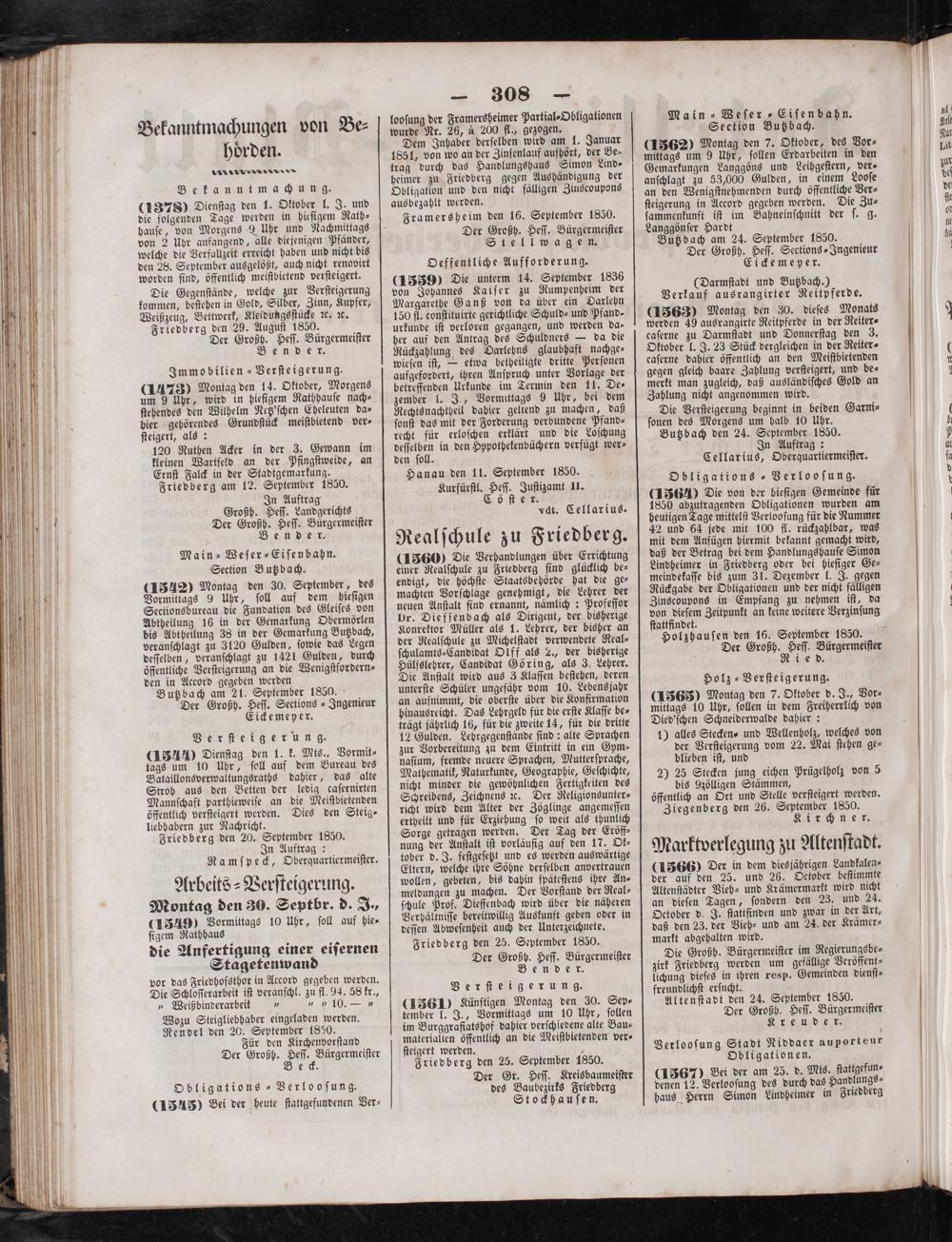 Dem Inhaber derſelben wird am 1. Januar 1851, von wo an der Zinſenlauf aufhört, der Be⸗ trag durch das Handlungshaus Simon Lind⸗ heimer zu Friedberg gegen Aushändigung der Obligation und den nicht fälligen Zinscoupons ausbezahlt werden.