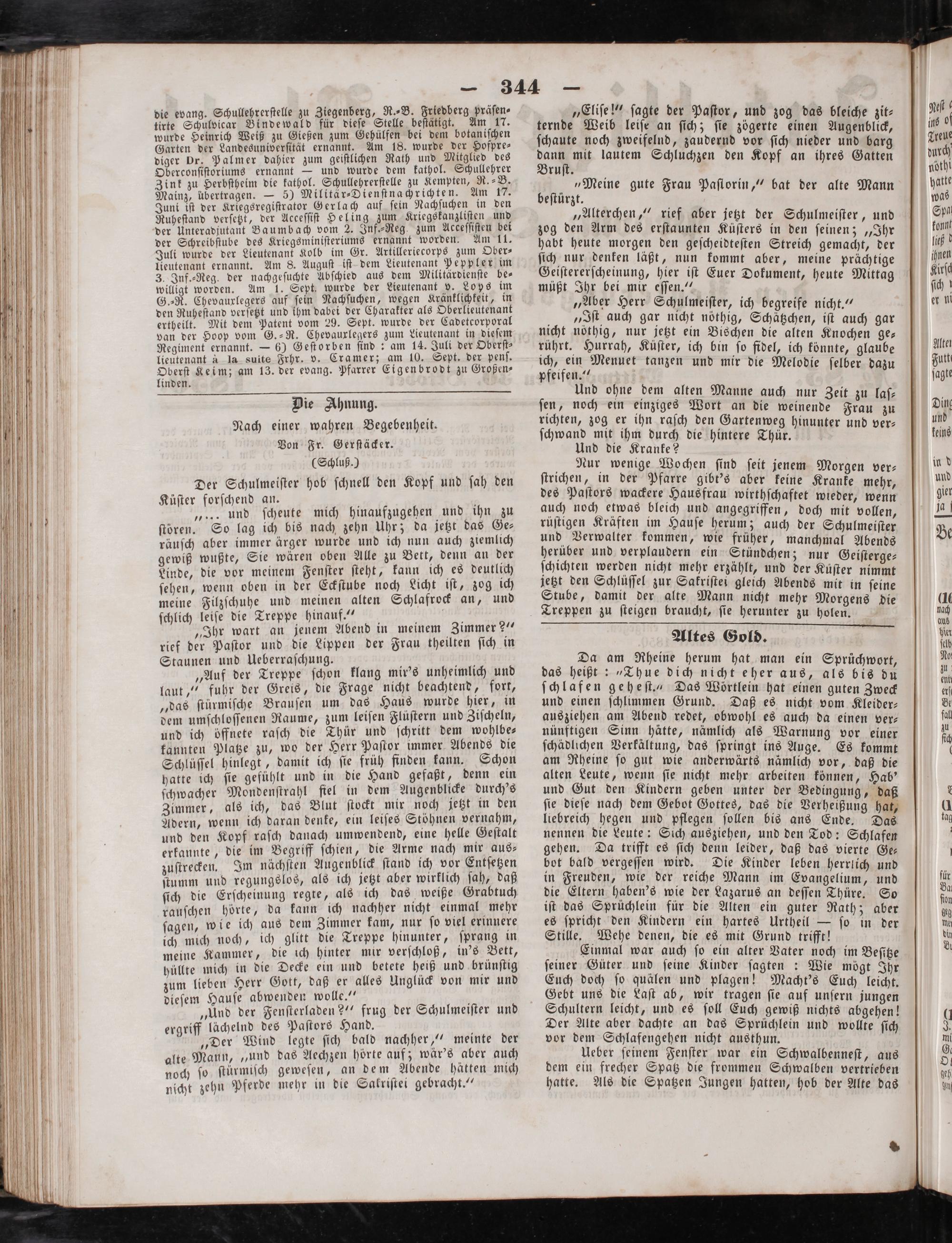 Da am Rheine herum hat man ein Sprüchw das heißt:„Thue dich nicht eher aus, 915 511 ſchlafen geheſt.“ Das Wörtlein hat einen guten Zweck und einen ſchlimmen Grund. Daß es nicht vom Kleider— ausziehen am Abend redet, obwohl es auch da einen ver— nünftigen Sinn hätte, nämlich als Warnung vor einer ſchädlichen Verkältung, das ſpringt ins Auge. Es kommt am Rheine ſo gut wie anderwärts nämlich vor, daß die alten Leute, wenn ſie nicht mehr arbeiten können, Hab' und Gut den Kindern geben unter der Bedingung, daß ſie dieſe nach dem Gebot Gottes, das die Verheißung hat, liebreich hegen und pflegen ſollen bis ans Ende, Das nennen die Leute: Sich ausziehen, und den Tod: Schlafen gehen. Da trifft es ſich denn leider, daß das vierte Ge— bot bald vergeſſen wird. Die Kinder leben herrlich und in Freuden, wie der reiche Mann im Evangelium, und die Eltern haben's wie der Lazarus an deſſen Thüre. So iſt das Spruͤchlein für die Alten ein guter Rath; aber es ſpricht den Kindern ein hartes Urtheil— ſo in der Stille. Wehe denen, die es mit Grund trifft!
